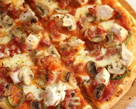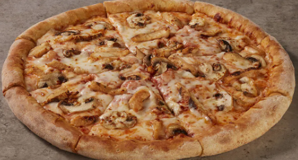 Pizza mediana 8 porciones. Ingredientes: pasta de tomate, extra queso, pollo y champiñones.