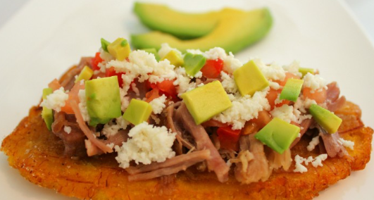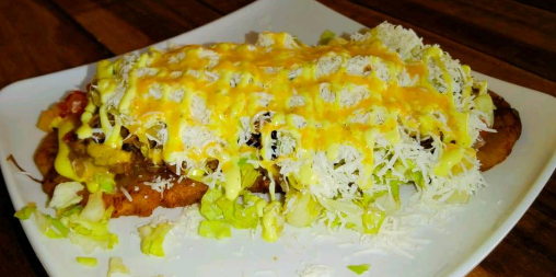 Patacón mixto individual: lleva pollo, carne desmechada y queso gratinado.