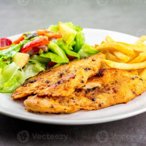 Pollo 220 gr , papas a la francesa, ensalada dulce