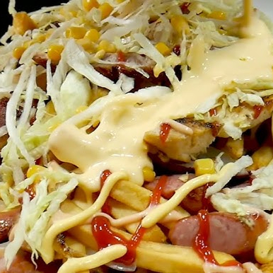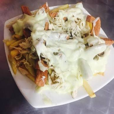 Papas , salchichas, maíz , queso costeño , lechuga, pollo