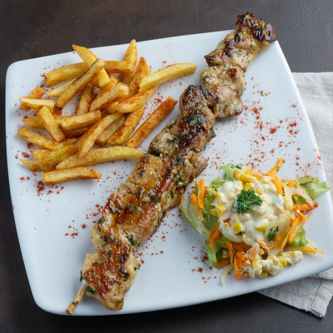 Chuzo de cerdo 200 gr , papas a la francesa, ensalada dulce
