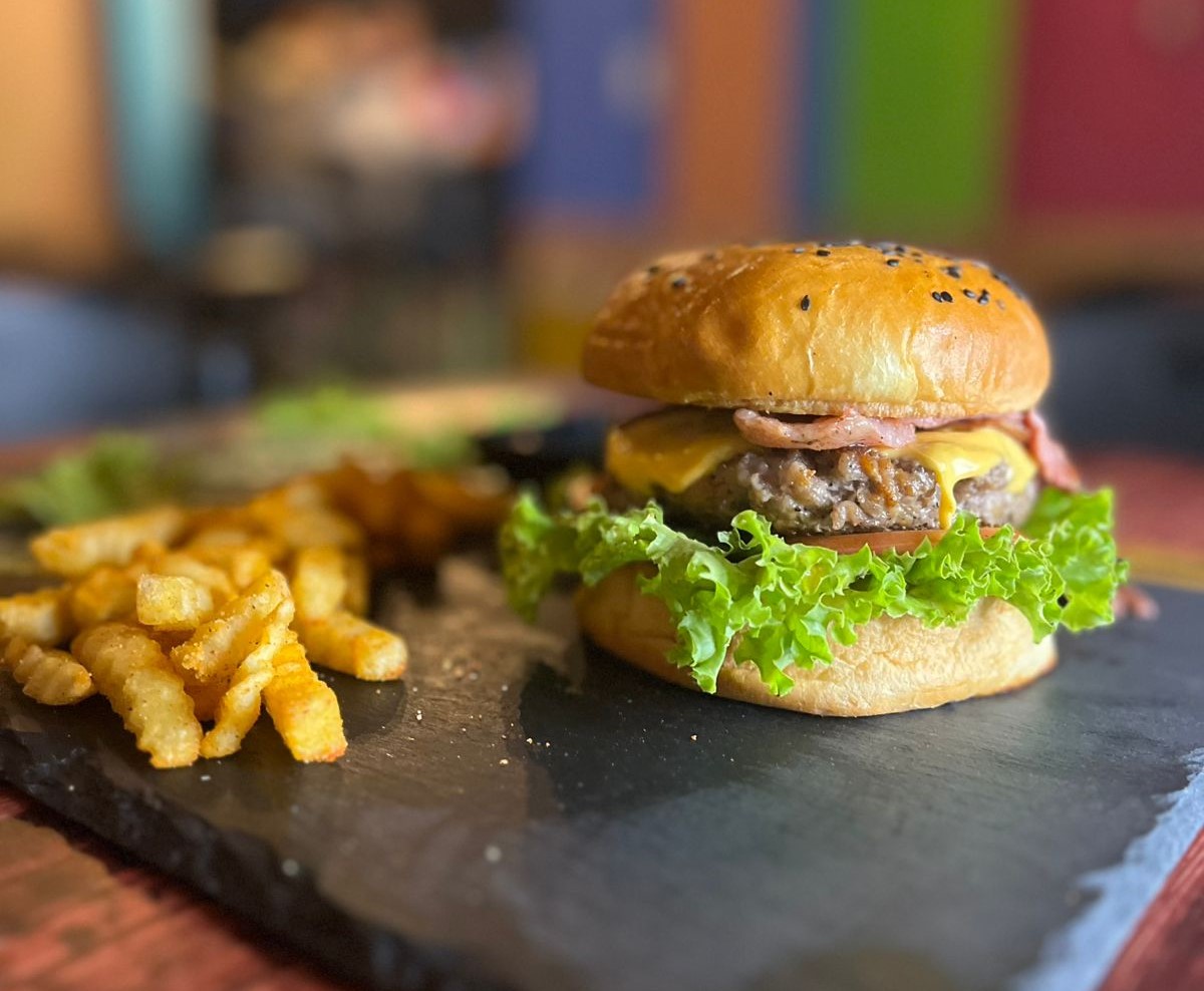 Pan ajonjolí sellado con un toque de mantequilla, carne de res al estilo morenita, lechuga crespa, tomate, cebolla grille, queso cheddar, acompañada de papas a la francesa y salsa de la casa.
