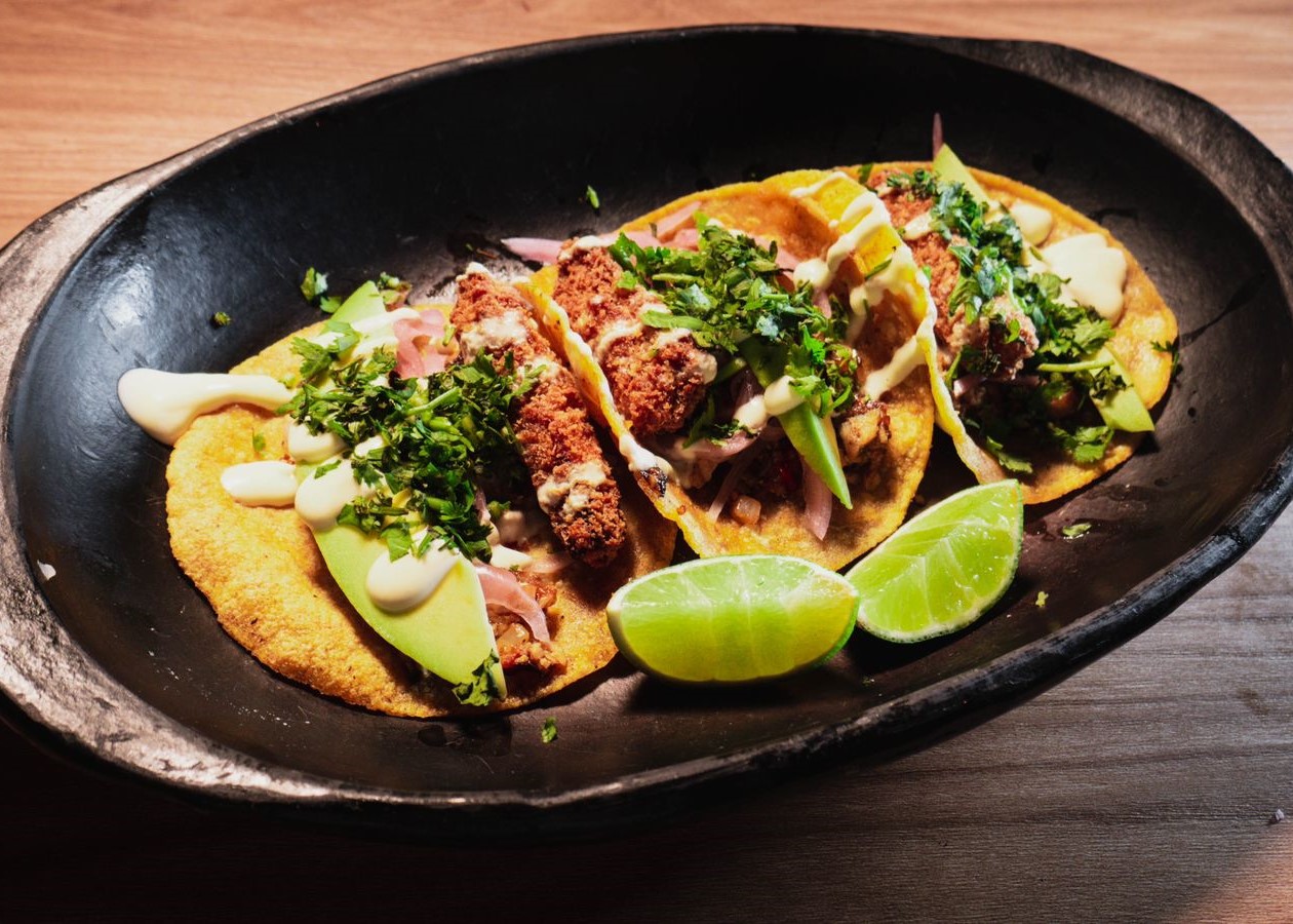 Tradicional tortilla de maíz mexicana con pechuga de pollo guisada y champiñones salteados, bastones de plátanos maduros rebozados, aguacate cortado en abanico y maicitos en sour cream acompañados de cascos de limón.