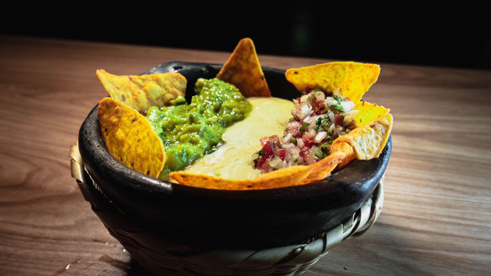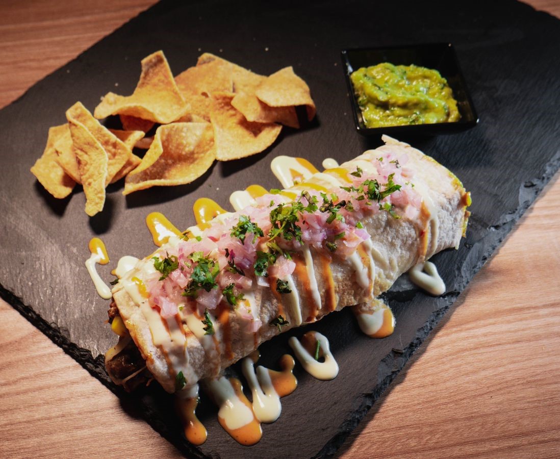 Tortilla de trigo con carne pulled pork dulce y queso mozzarella de búfala, lechuga, pico de gallo, salsa de pimentón, mayonesa de cilantro, sour cream, acompañado de totopos (nachos) y guacamole artesanal.