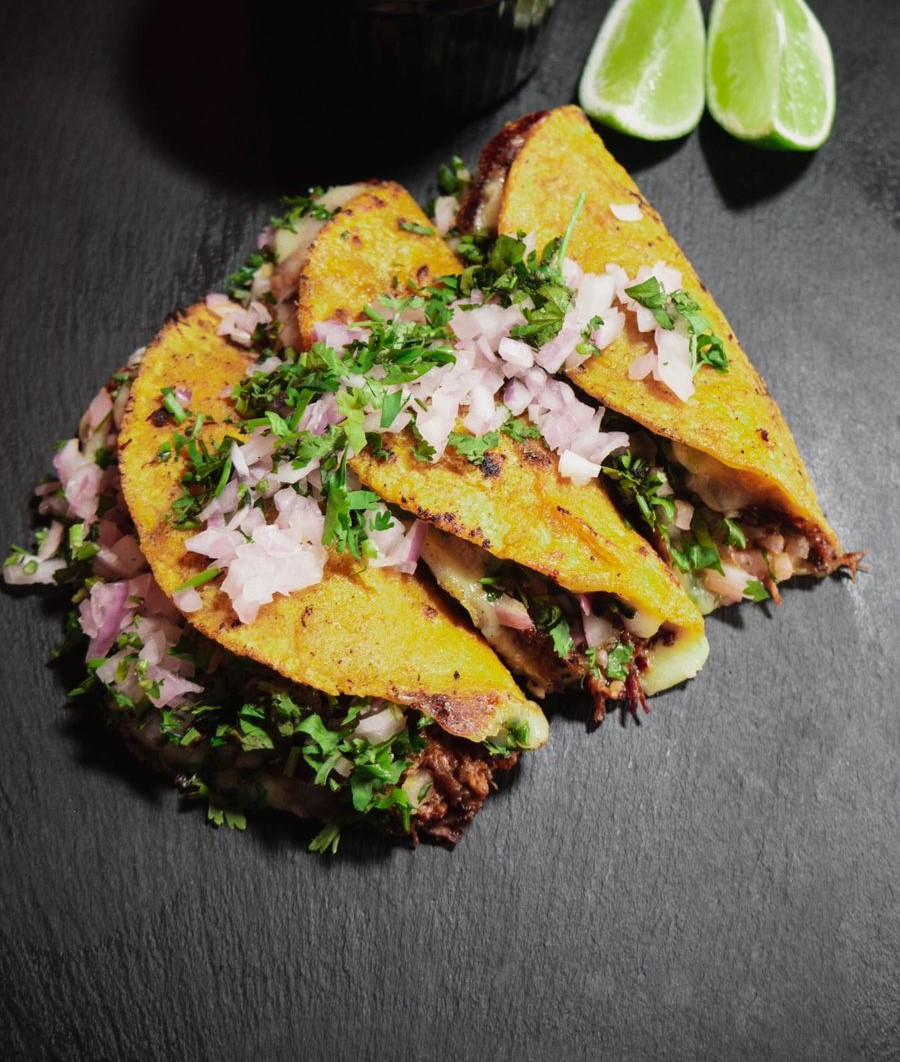 Tradicional tortilla de maíz mexicana con res en cocción a fuego bajo con cilantro, cebolla y queso mozzarella de búfala, acompañados de cascos de limón y caldo de birria, una combinación bien perrona. 3 unidades