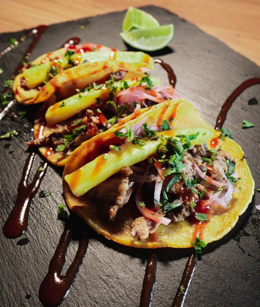 Tradicional tortilla de maíz mexicana con cerdo braseado y piña duce asada, cilantro y cebolla roja encurtida acompañados de cascos de limón.