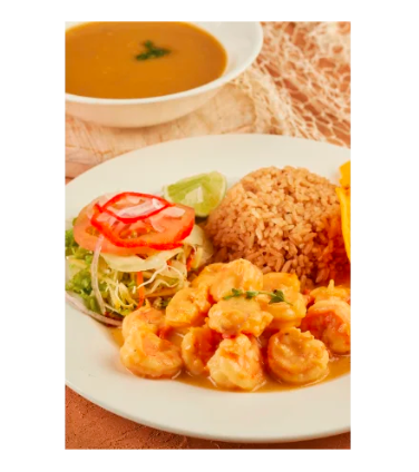 Camarones al ajillo, acompañado sopa de pescado, tostones de plátano; arroz y ensalada a elección. No incluye bebida.