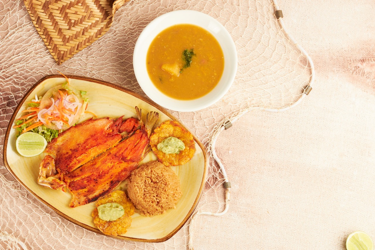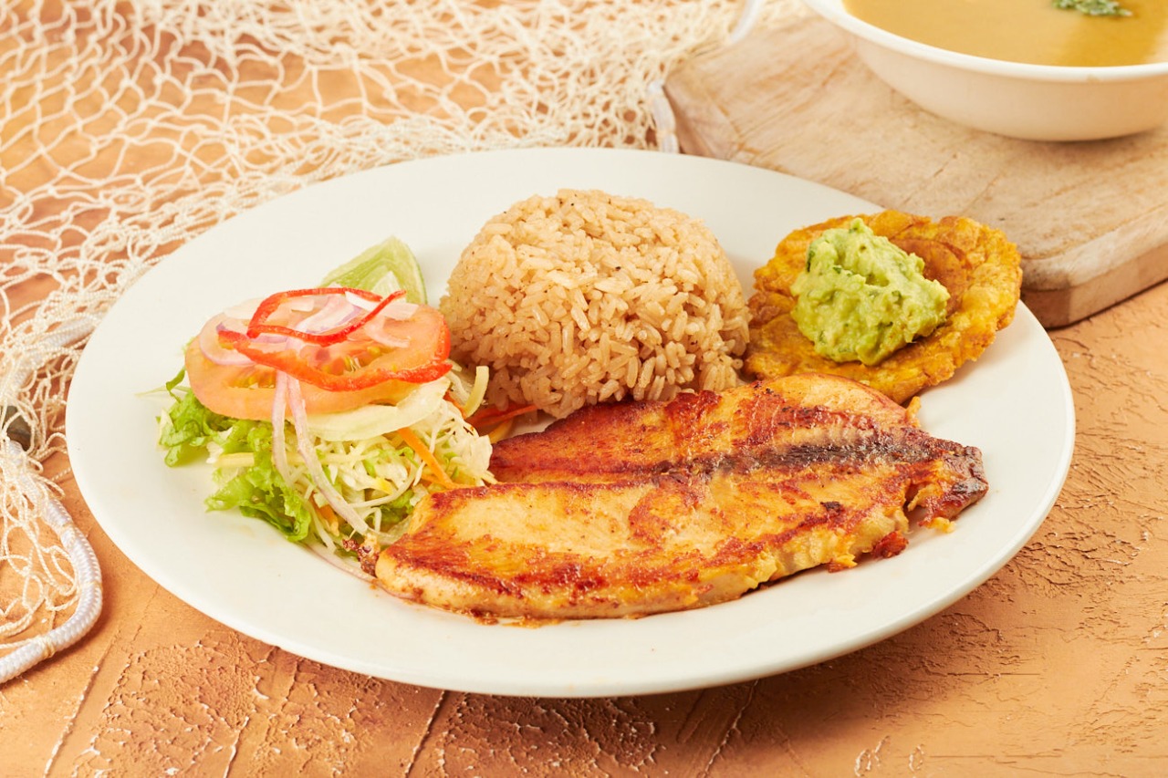 Filete de tilapia a la plancha acompañado de sopa de pescado, patacón; arroz, ensalada y bebida a elección.