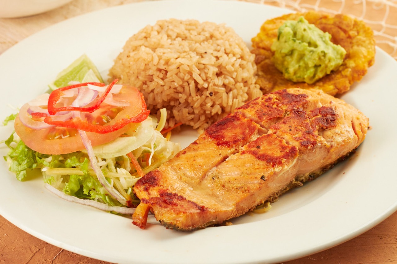 Salmón a la plancha 200 gr, acompañado de sopa de pescado, patacón; arroz y ensalada a elección. No incluye bebida.