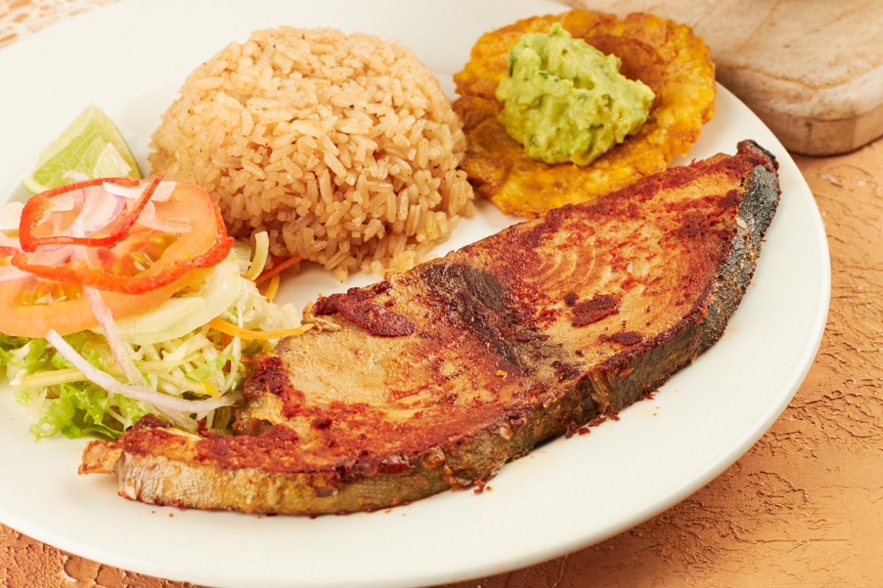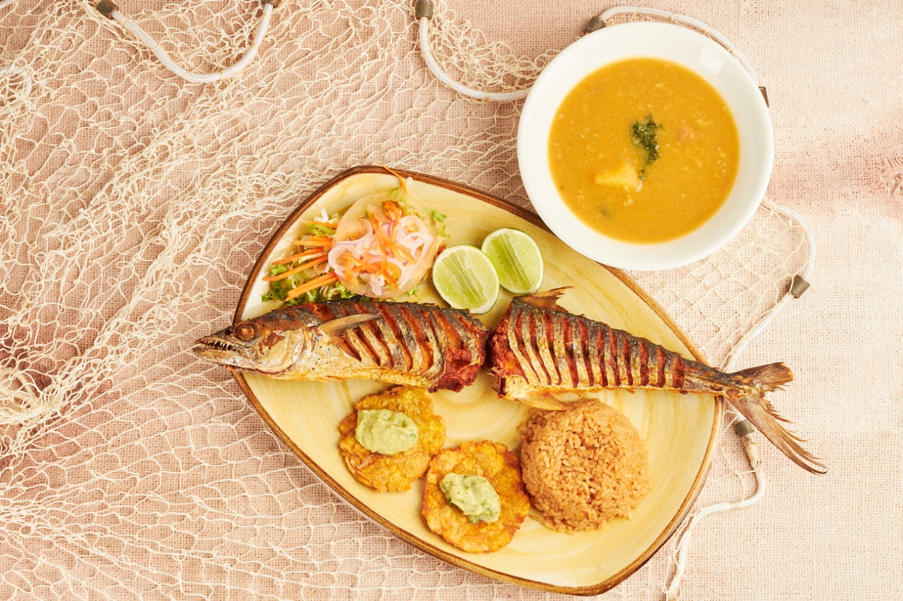 Sierra (350 gramos) entera frita acompañada de sopa de pescado, patacón; arroz y ensalada a elección. No incluye bebida