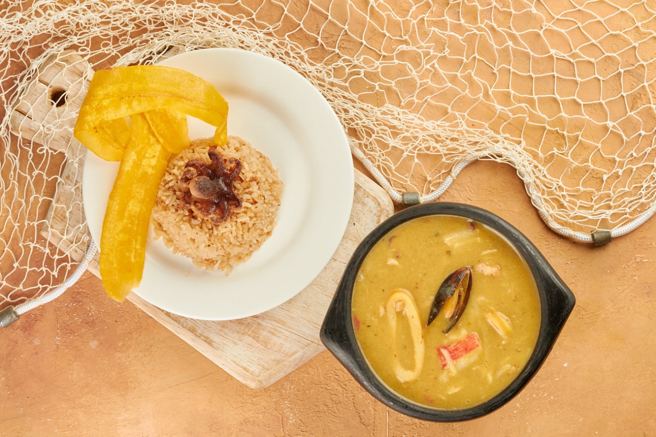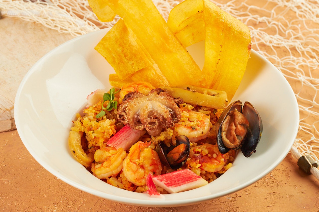 Arroz con mejillones, calamar, pulpo, camarón, palmitos de cangrejos, trozos de pescado. No incluye bebida.