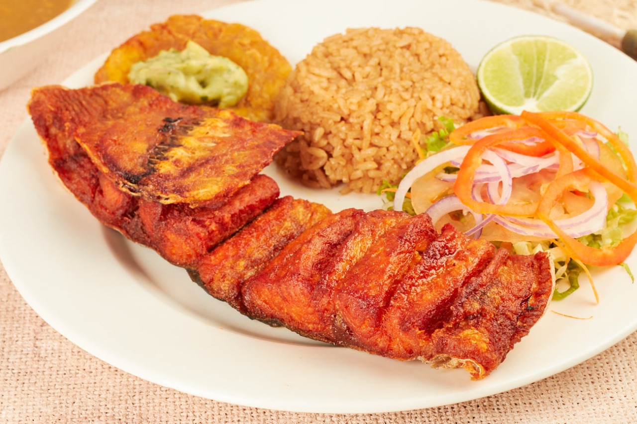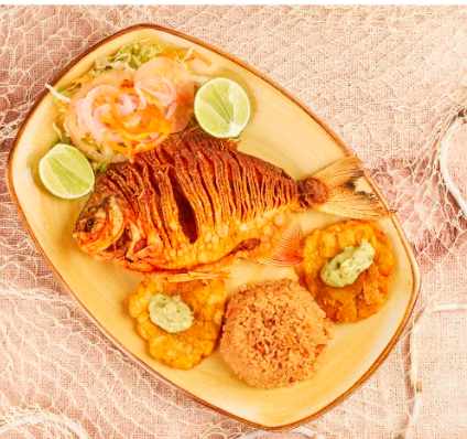 Delicioso pescado frito en forma de chicharrón, carnudo y sin grasa; acompañado de patacón, ensalada y caldo de pescado.