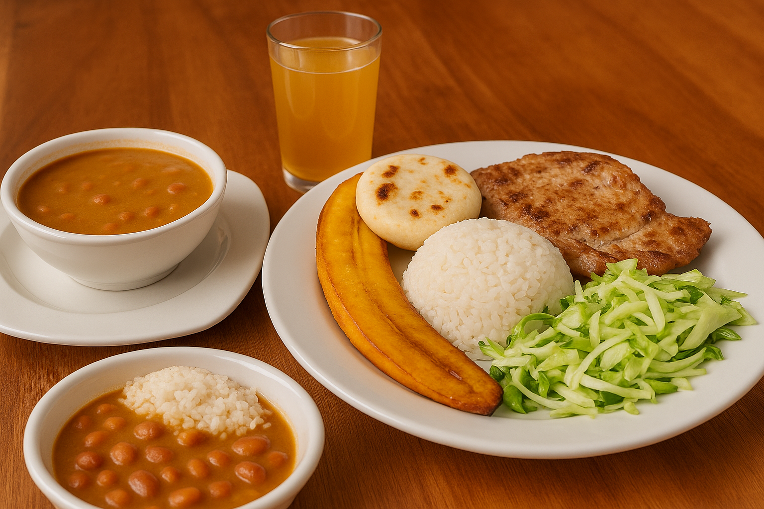 Sopa del día mas proteina a eleccion, mas arroz, mas maduro, mas ensalada mas guandolo.