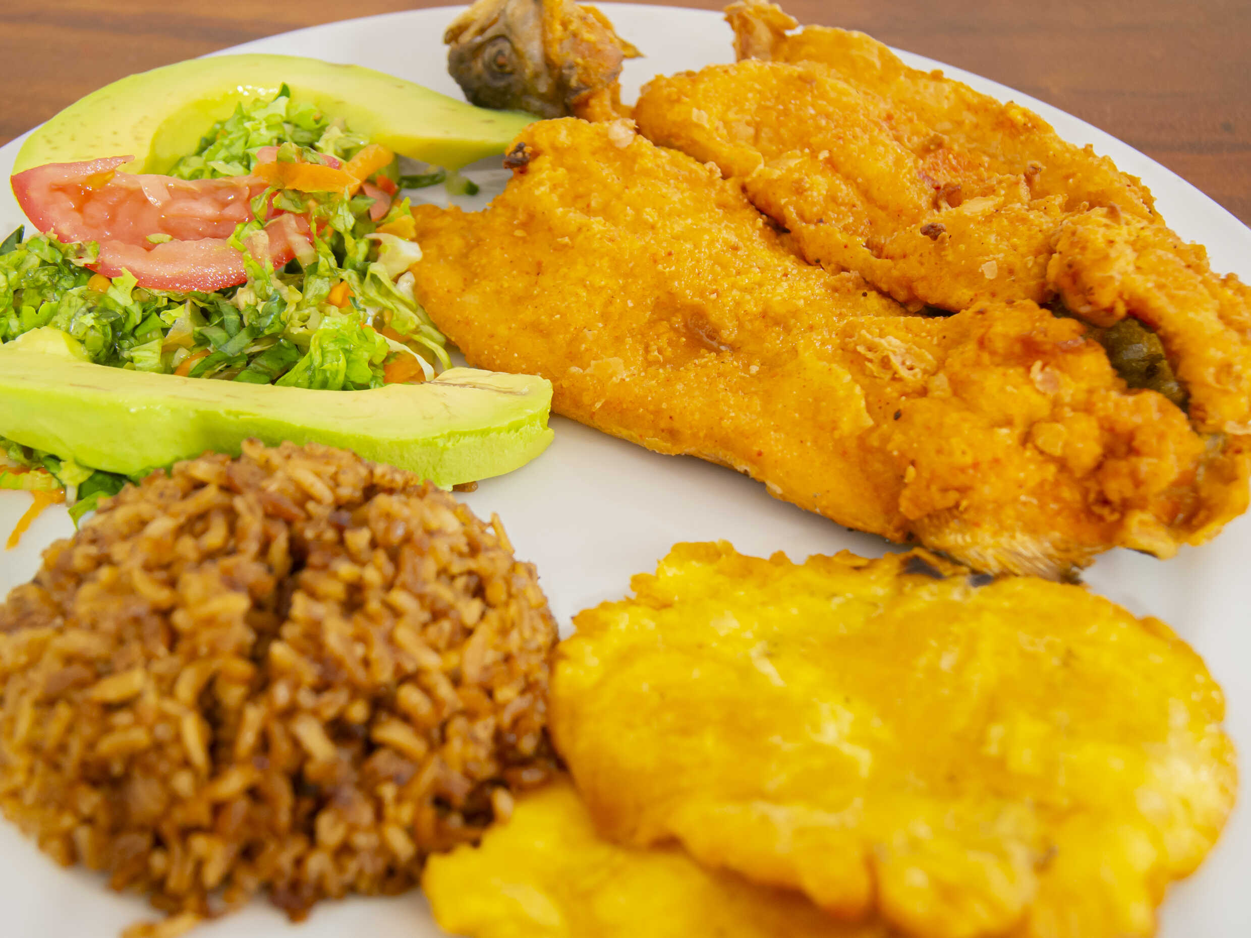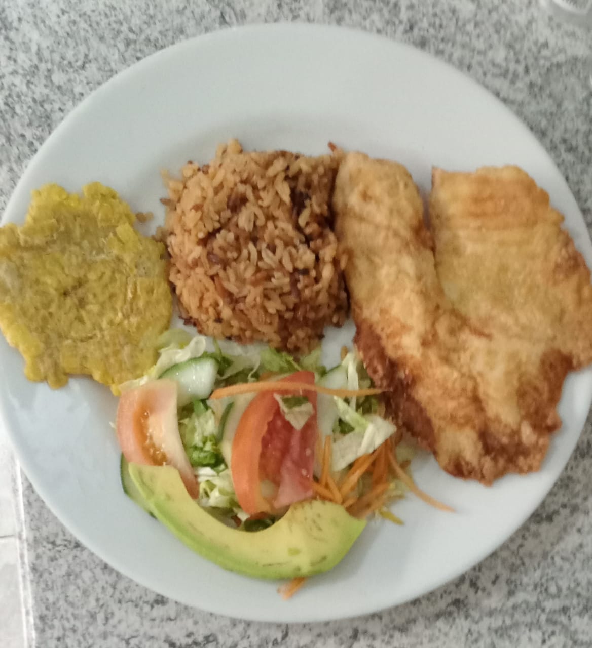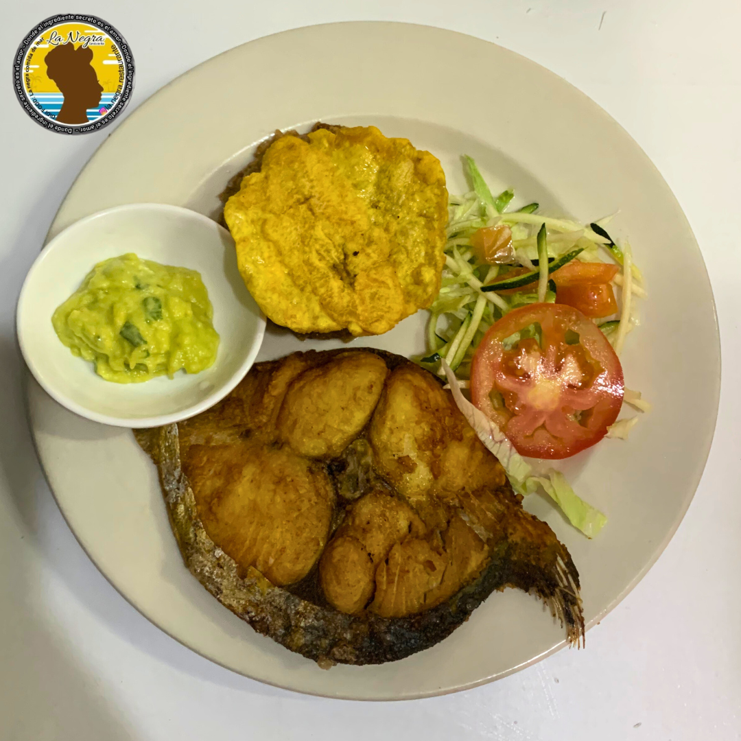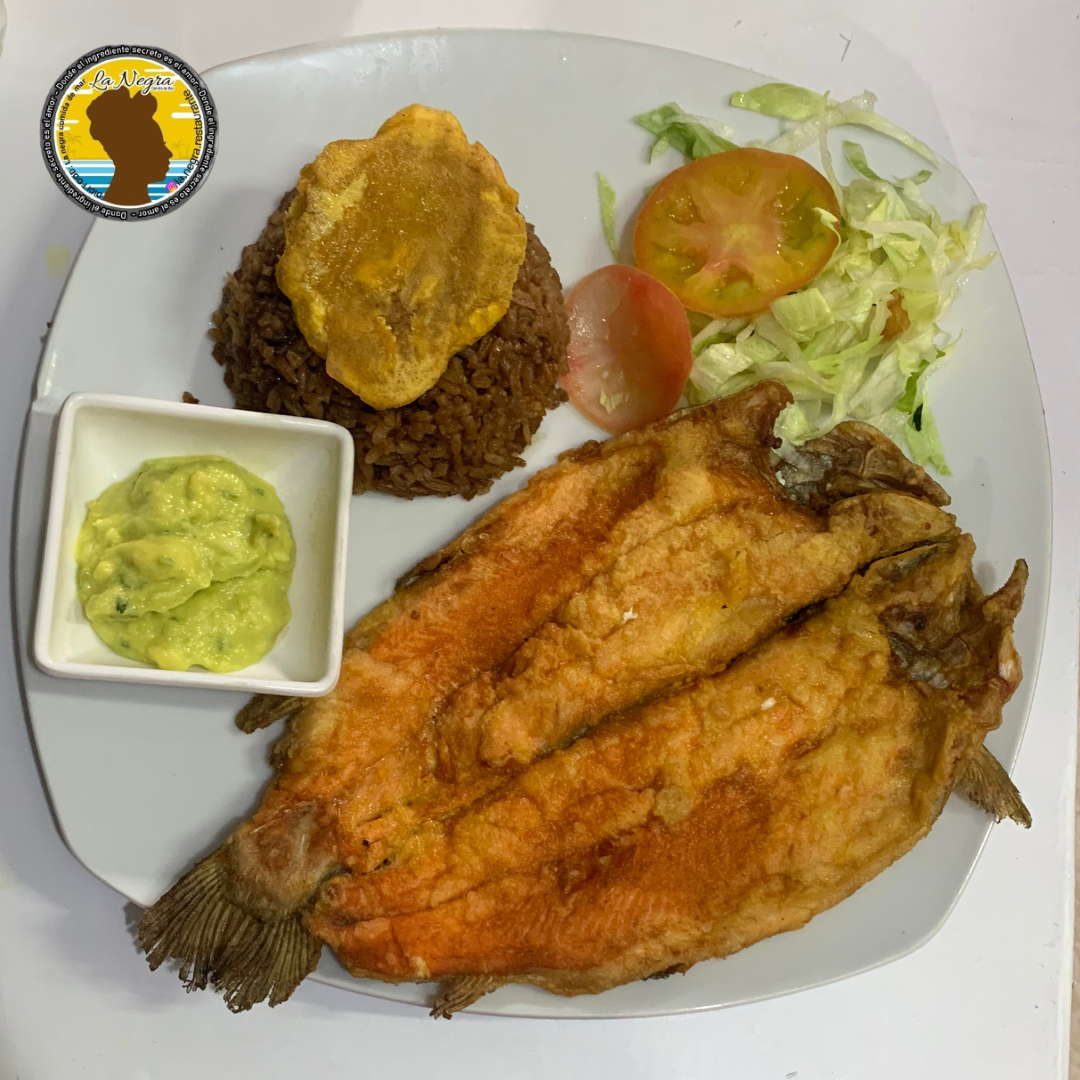 Deliciosa mojarra acompañada de patacón, arroz con coco, ensalada y bebida