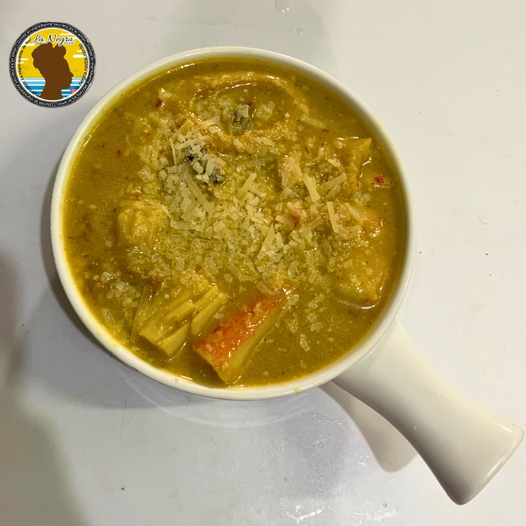 Cazuela con pescado blanco, pulpo, pota, anillos de calamar, palmitos de cangrejo, camarones, almeja y mejillones, acompañada con arroz de coco, patacones y ensalada de la casa.