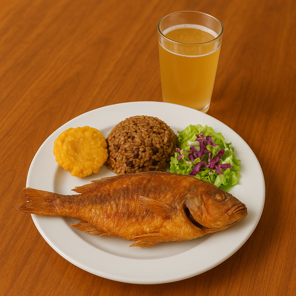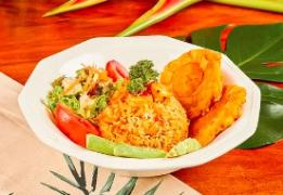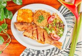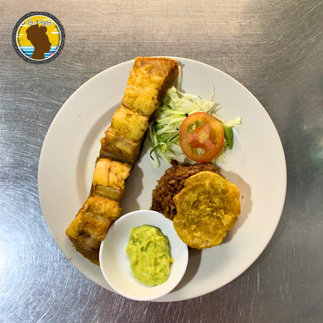 Trucha con arroz de coco, patacones, ensalada de la casa y acompañamiento a elegir.