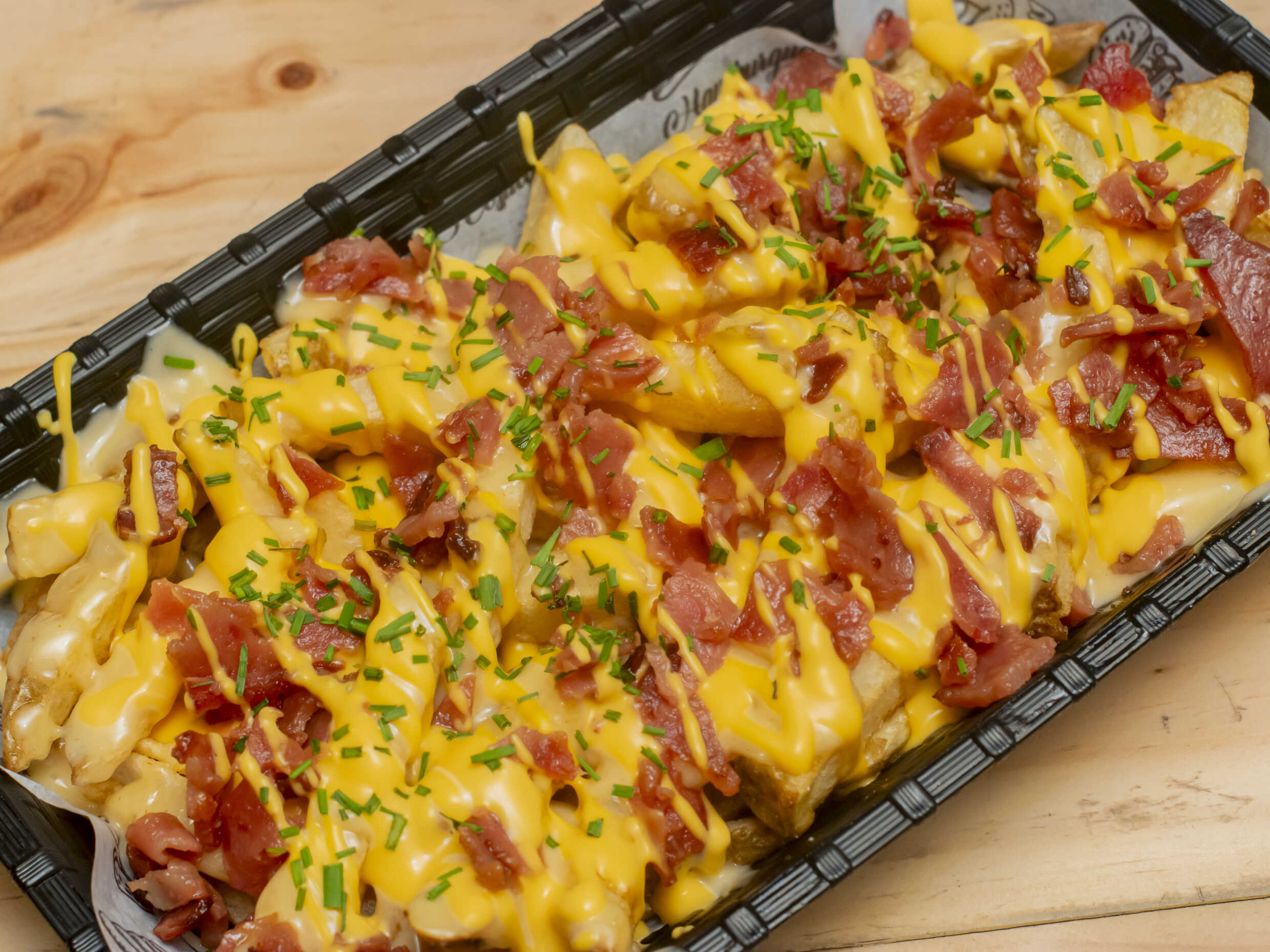 Papas, panceta dulce, cebollín y salsa cheddar de la casa.