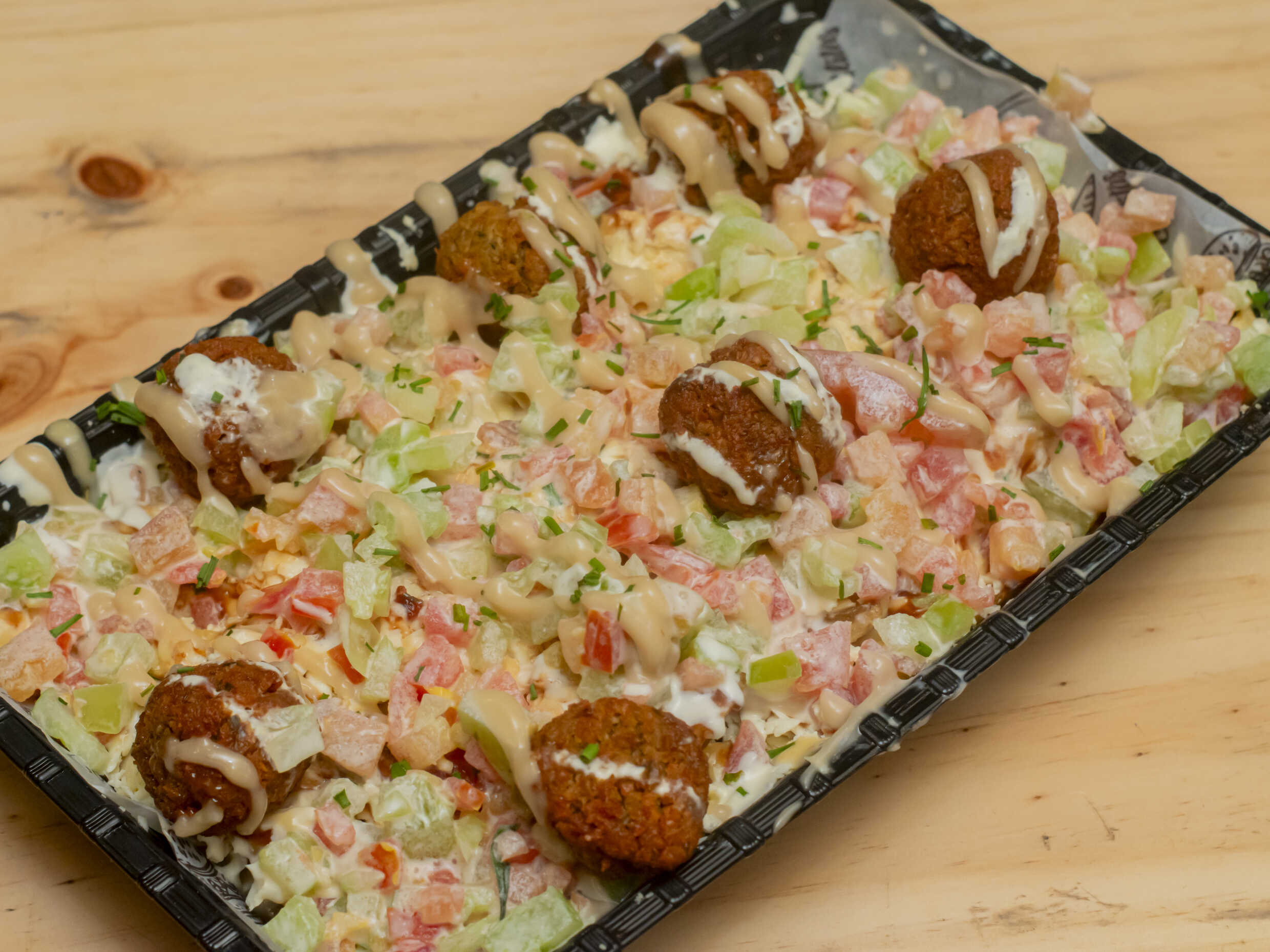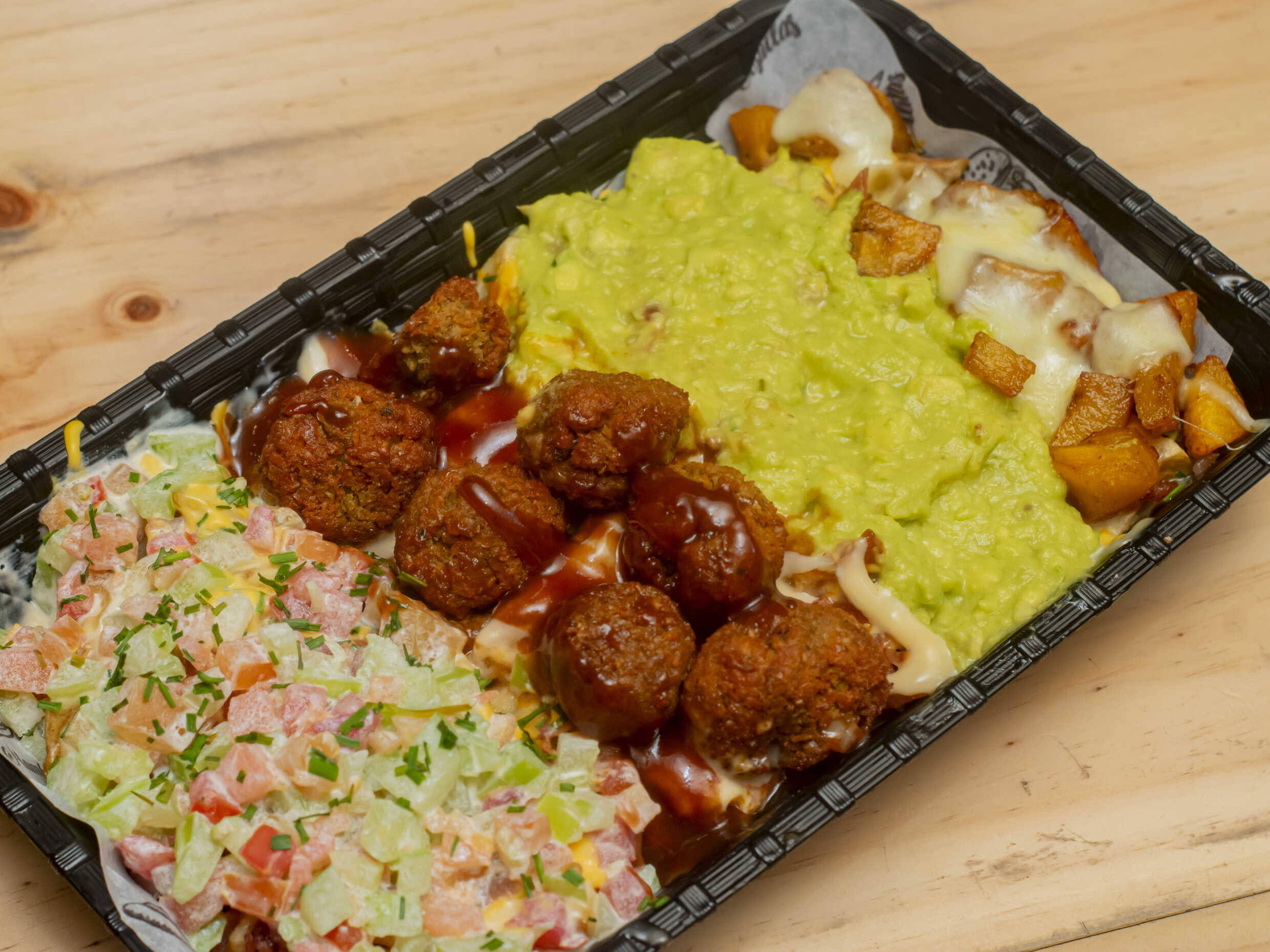 Papas, proteína vegetal de lentejas y garbanzos, guacamole, madurito, queso mozzarella, cebollín, suero, mayonesa de sriracha y salsa BBQ.