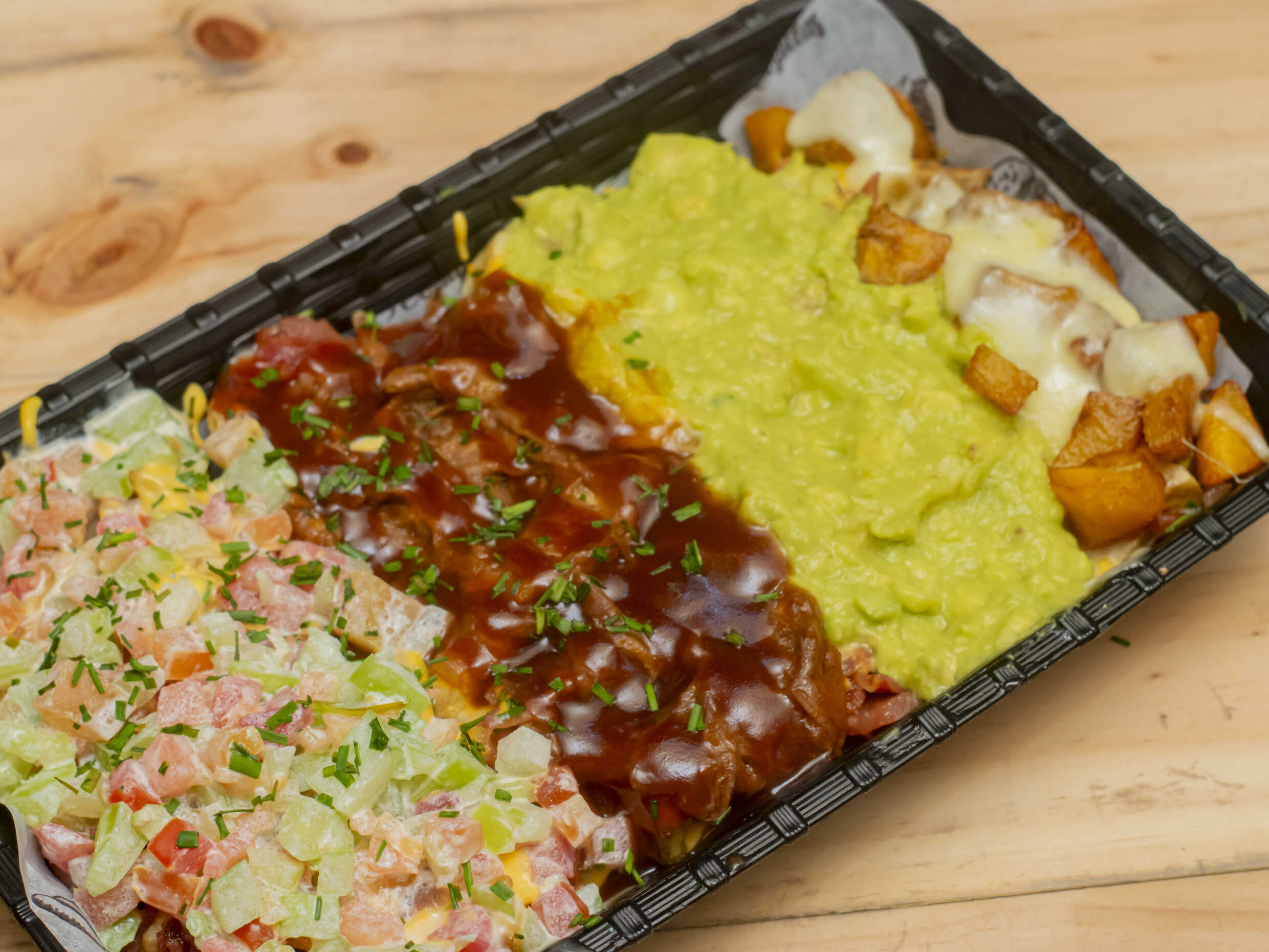 Papas, carne desmechada, pico de gallo, guacamole, maduritos, queso mozzarella, cebollín, mayonesa de sriracha y salsa BBQ.