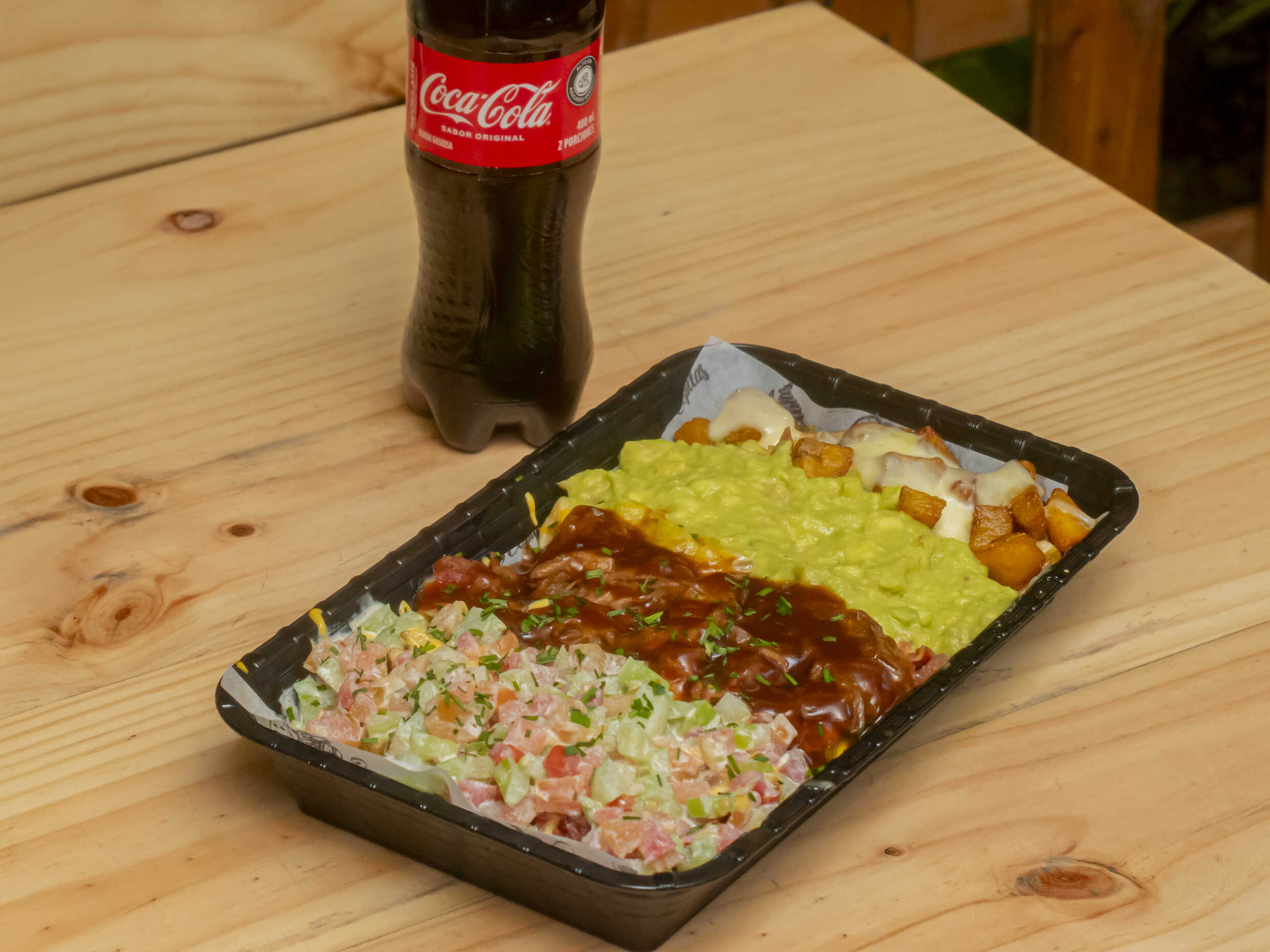 (platillo personal )(Papas, carne desmechada, pico de gallo, guacamole, maduritos, queso mozzarella, cebollín, mayonesa de sriracha y salsa BBQ + Gaseosas 250ml