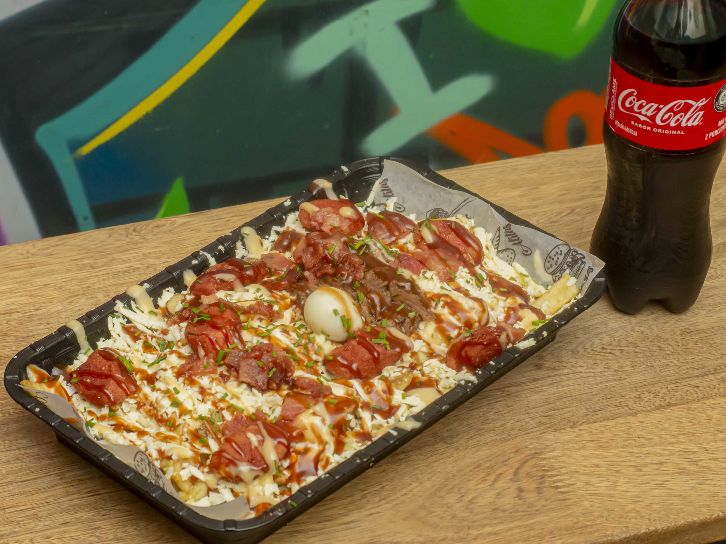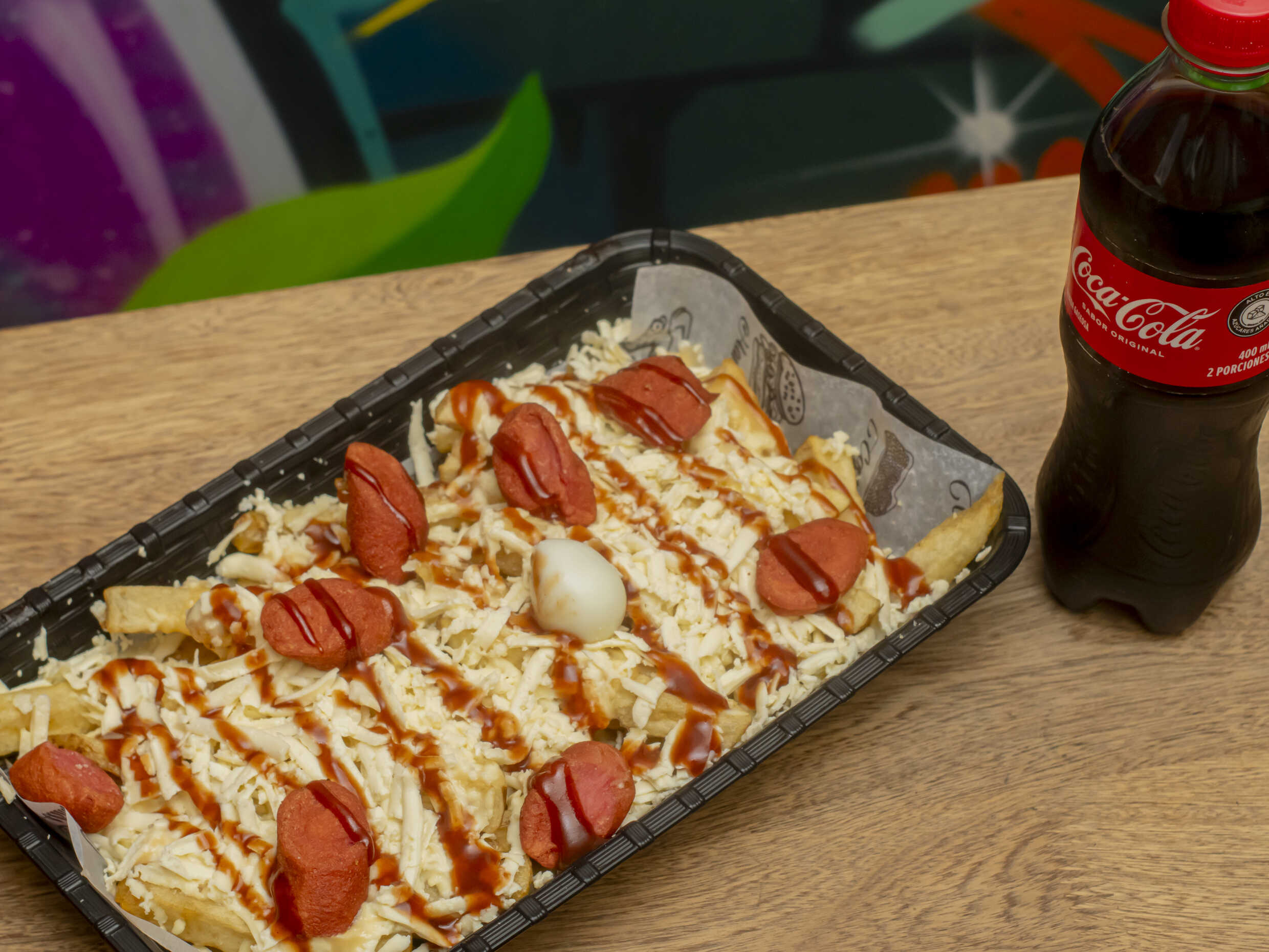 Papas, tocineta, salchichas, carne desmechada, queso, huevo de codorniz, cebollín, salsa BBQ, mayonesa de sriracha y suero + Gaseosa 250ml
