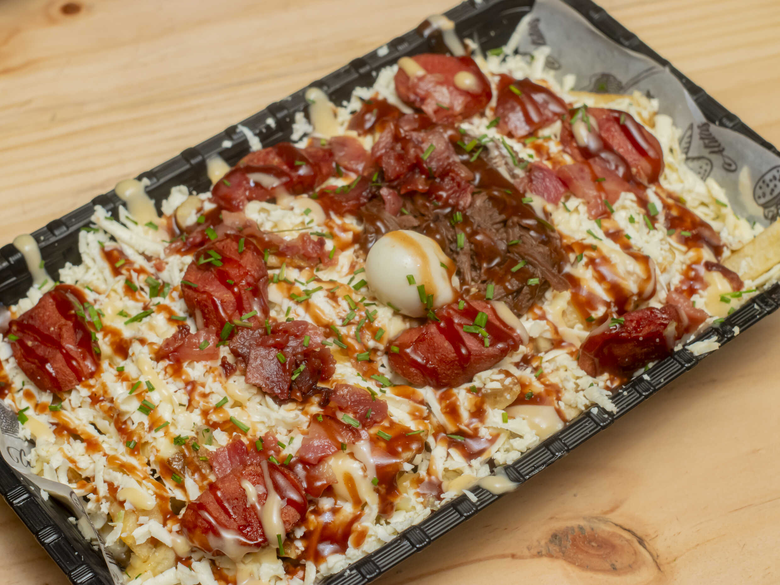 Papas, tocineta, salchichas, carne desmechada, queso, huevo de codorniz, cebollín, salsa BBQ, mayonesa de sriracha y suero.