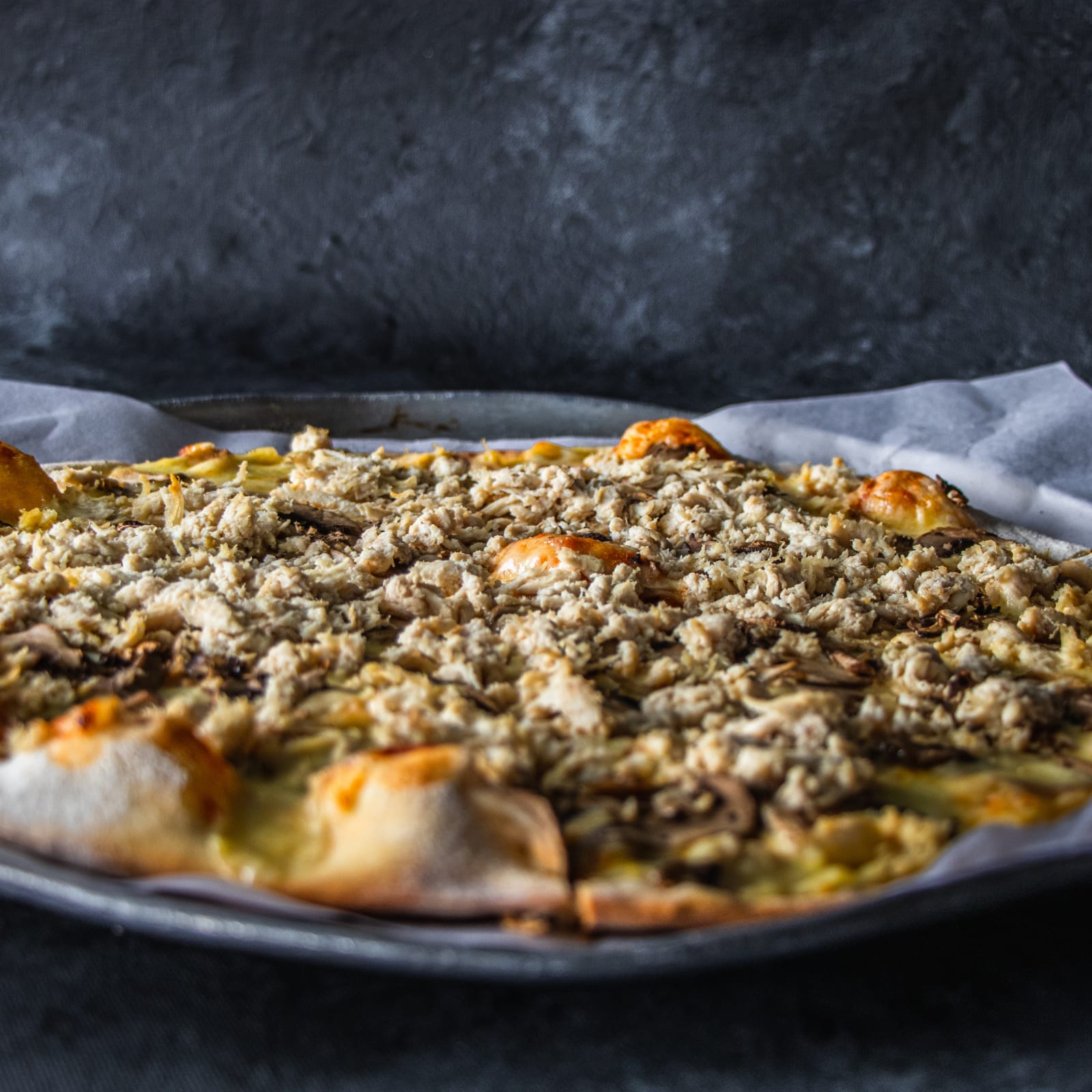 Deliciosa Tocienta, Albahaca Fresca, Champiñones y Baño de Queso Parmesano.