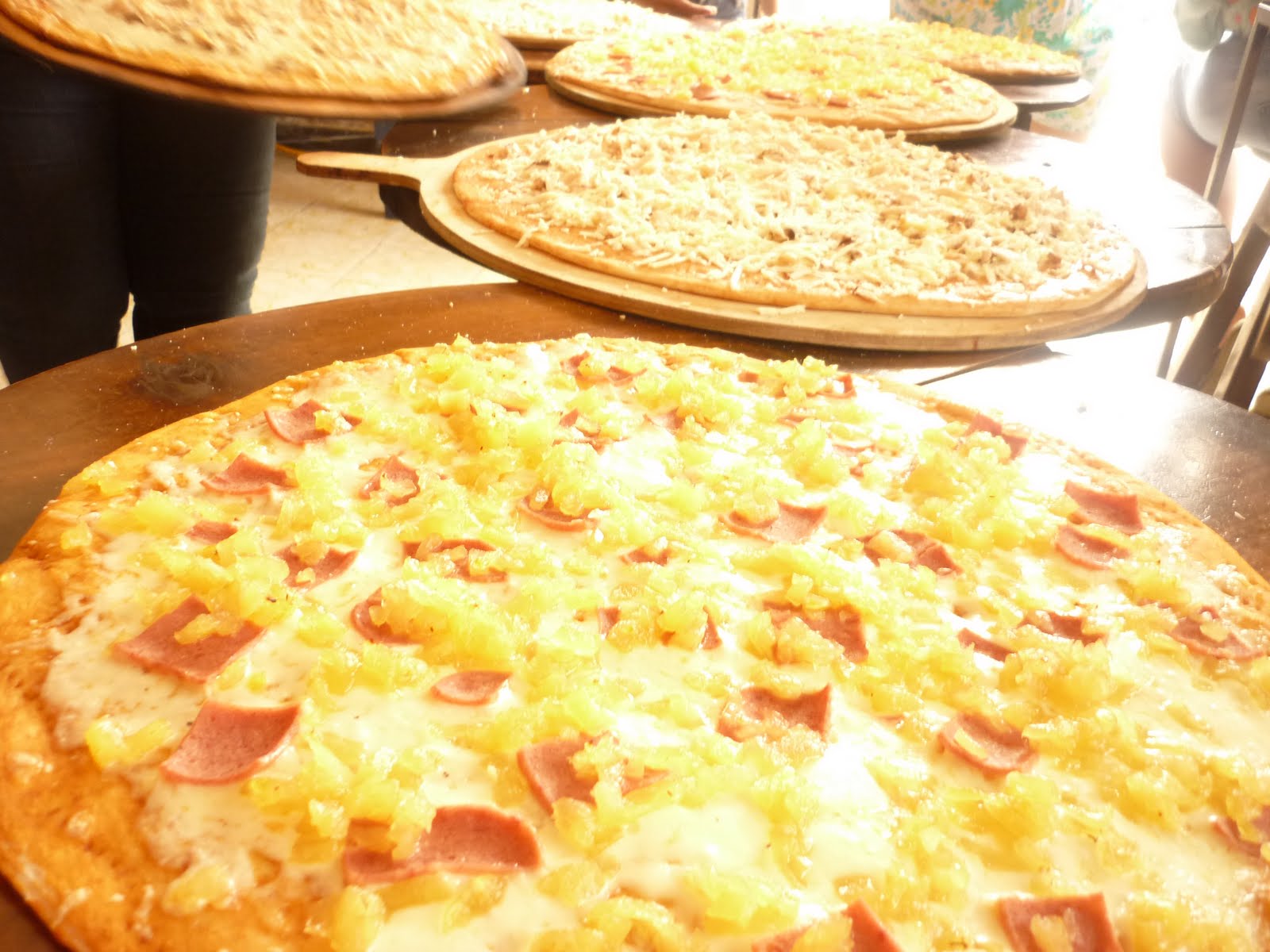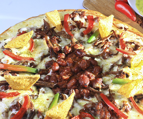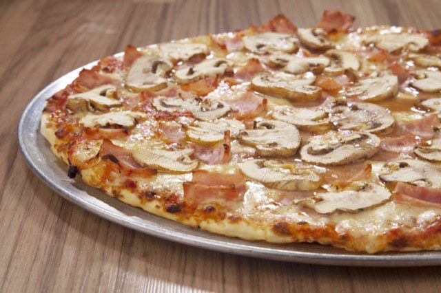 Masa Blanda,Doble Jamón, Champiñones, Tomate Chonto,Cebolla y Pimentón.