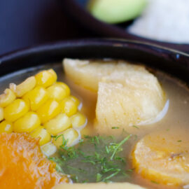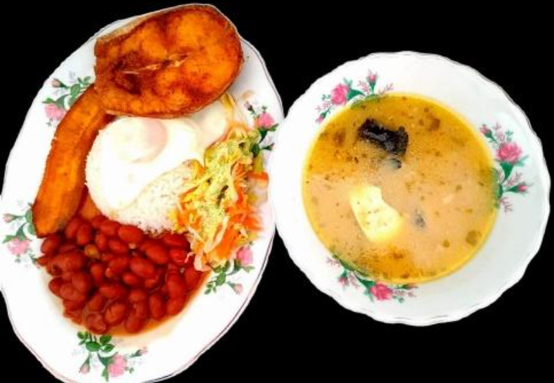 Sopa de pescado o del día, acompañada por una bandeja con arroz, ensalada, tajada de maduro y pollo o cerdo.