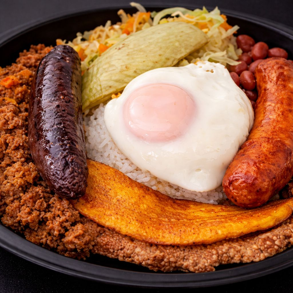 Arroz, carne molida, chicharrón, chorizo, morcilla, frijoles, huevo, ensalada, tajada, aguacate y arepa.