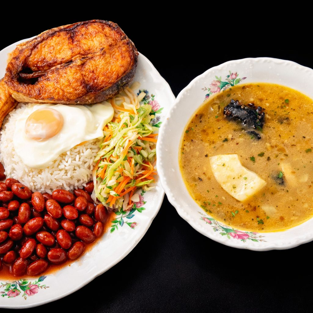 Sopa a elección, acompañada de una bandeja que contiene arroz, ensalada, tajada de maduro, huevo frito y proteína a elección y bebida a elección. (Porción personal)