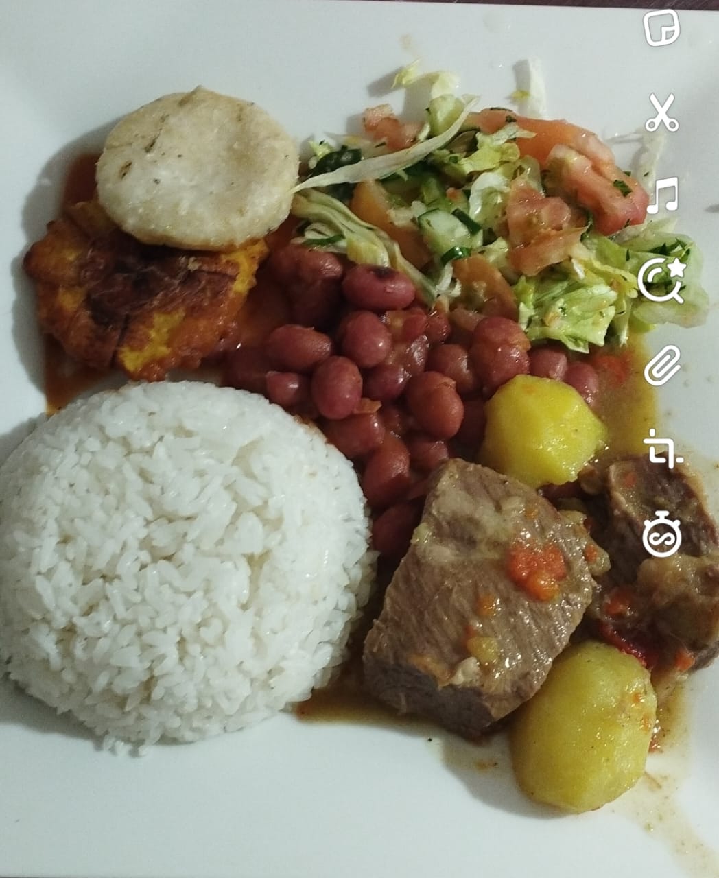Arroz, ensalada, pollo, frijoles, tajada o arepa.