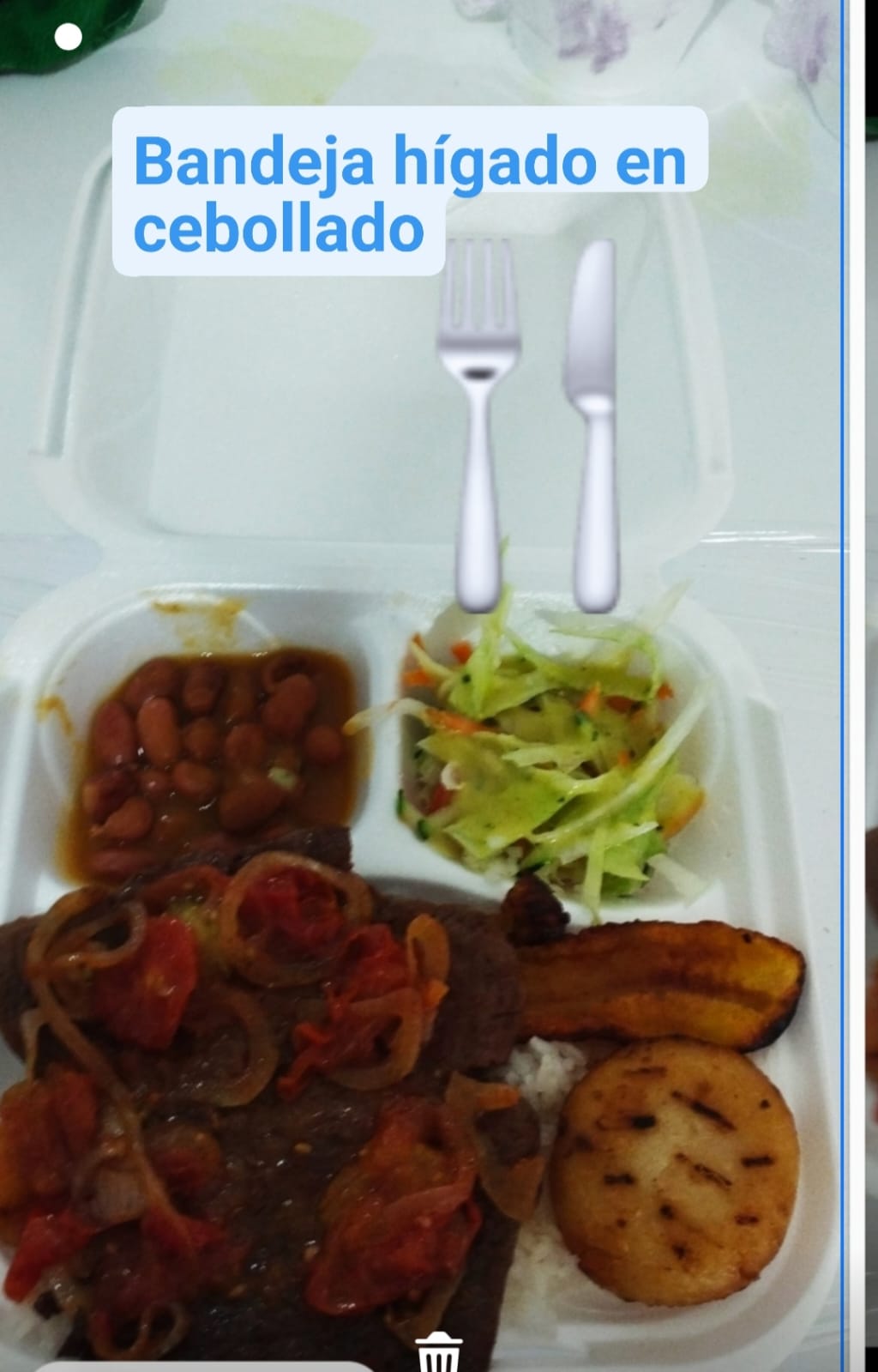 Arroz, hígado, ensalada, tajada o arepa.