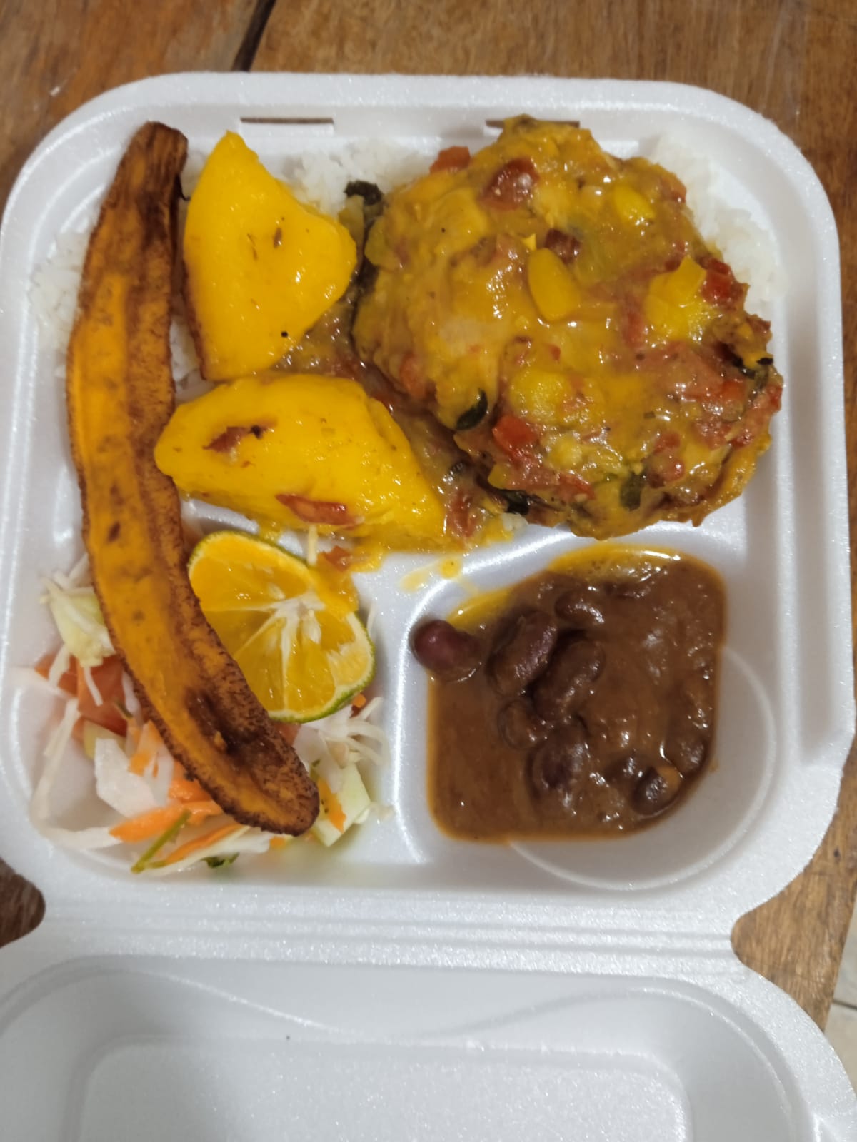 Carne de res ( 120 gramos ), arroz, ensalada del día, tajada ( 1 pieza)o arepa ( 1 pieza), frijoles ( porción personal) jugo del dia de 12 onzas