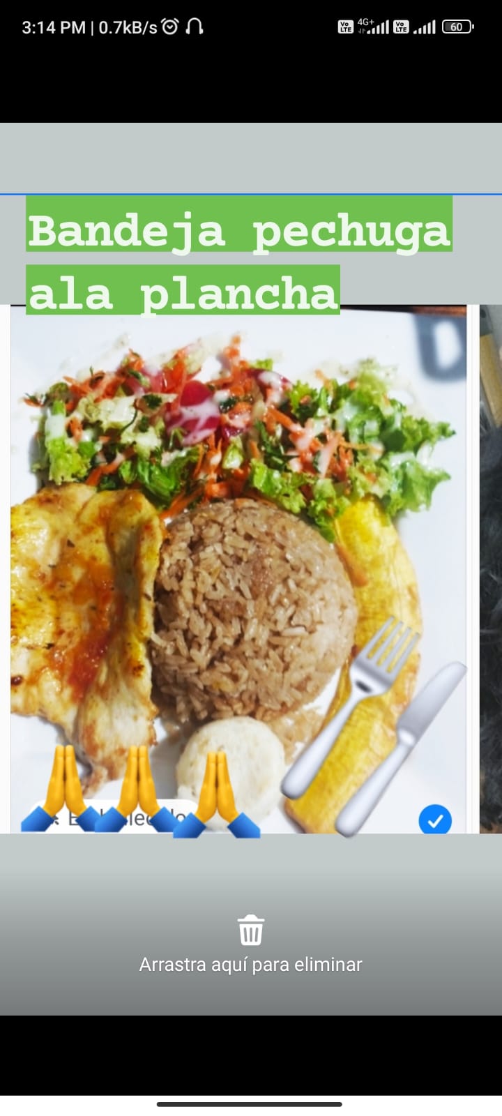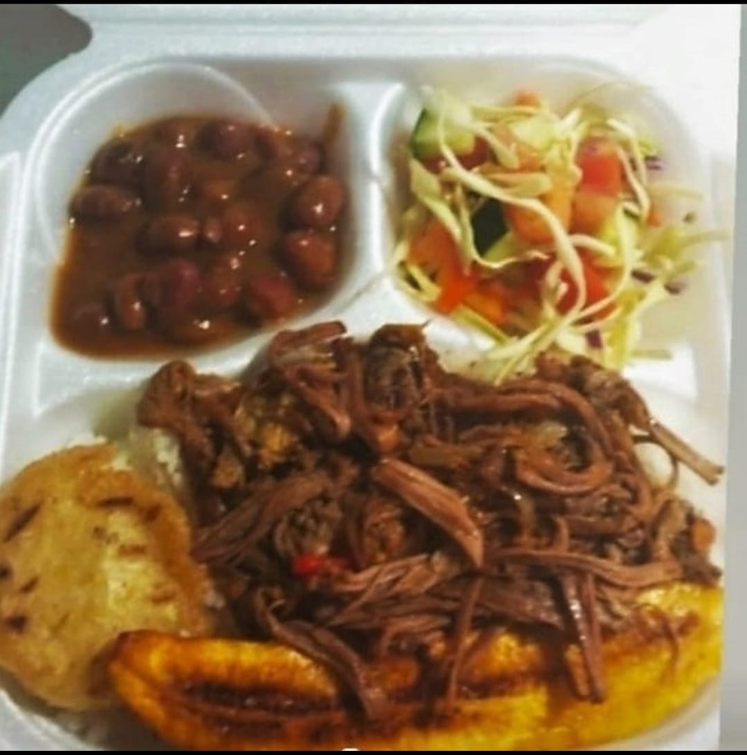 Carne desmechada 120 gramos , arroz , ensalada del día , tajada ( 1 pieza)y arepa ( 1 pieza), frijol ( porción personal), jugo del dia de 12 onzas