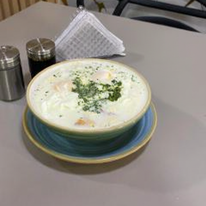 Changua bogotana, con 2 huevos, almojábana o pan de queso según disponibilidad.