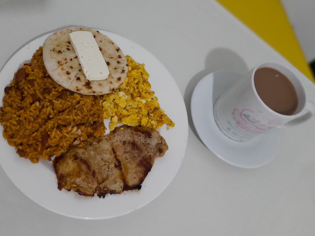 calentado con arepa,quesito,huevos revueltos con aliño , carne de su preferencia res ,cerdo,o chicharron ,cafe con leche o chocolate