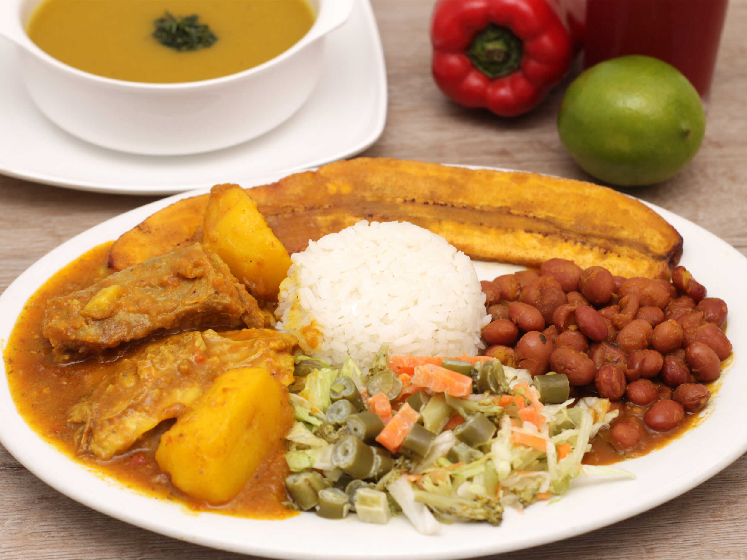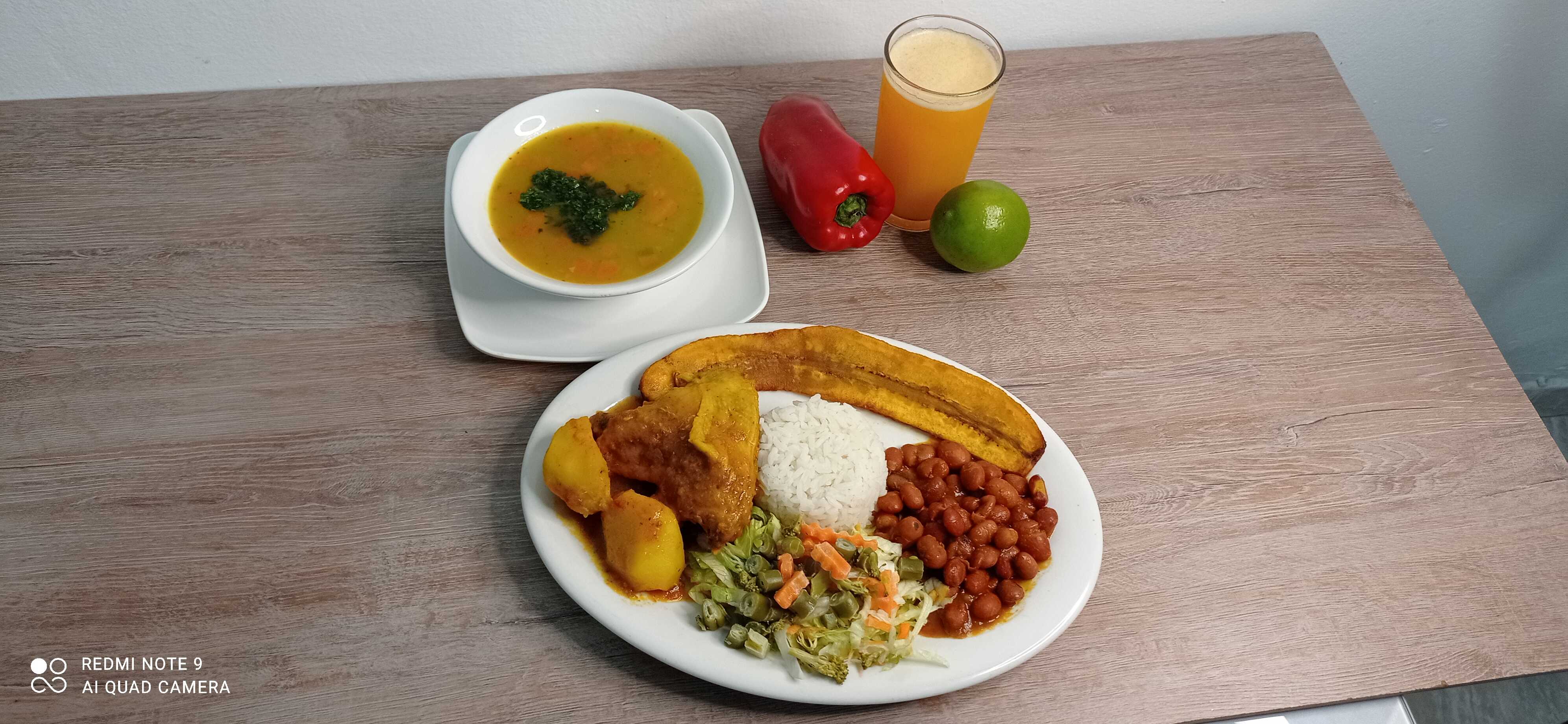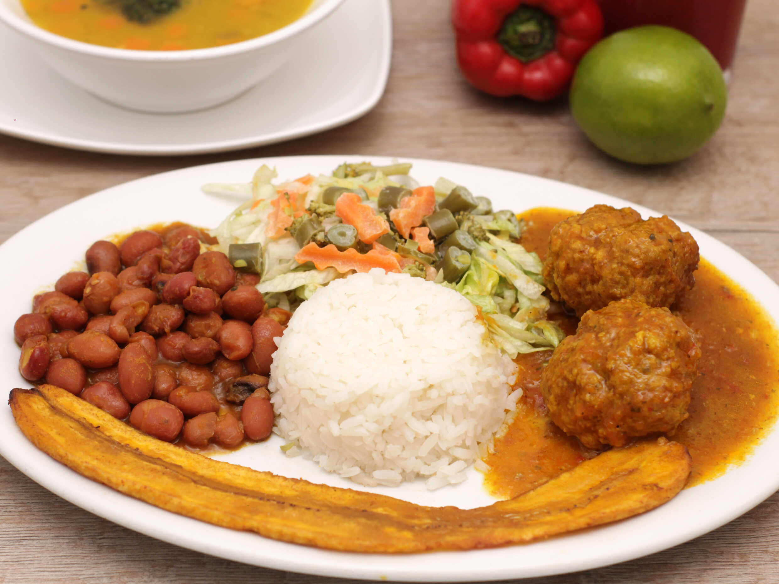albondigas de cane de res y cerdo en salsa, mas su seco; arroz, frijol, tajada de maduro, ensalada, sopa y jugo del dia