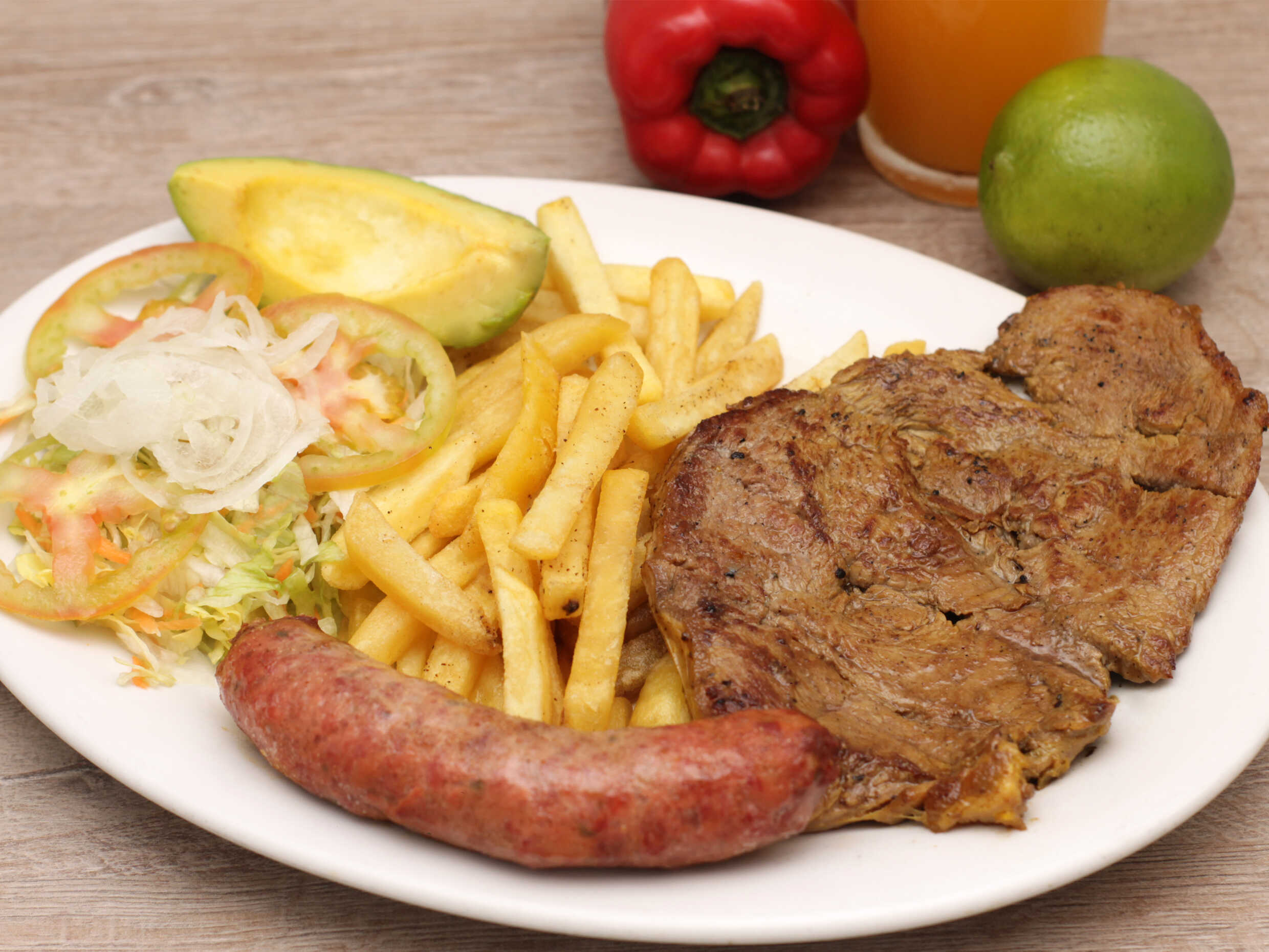 Filete de carne de res de 250gr aproximadamente, con chorizo,papas fritas, aguacatre y ensalada.