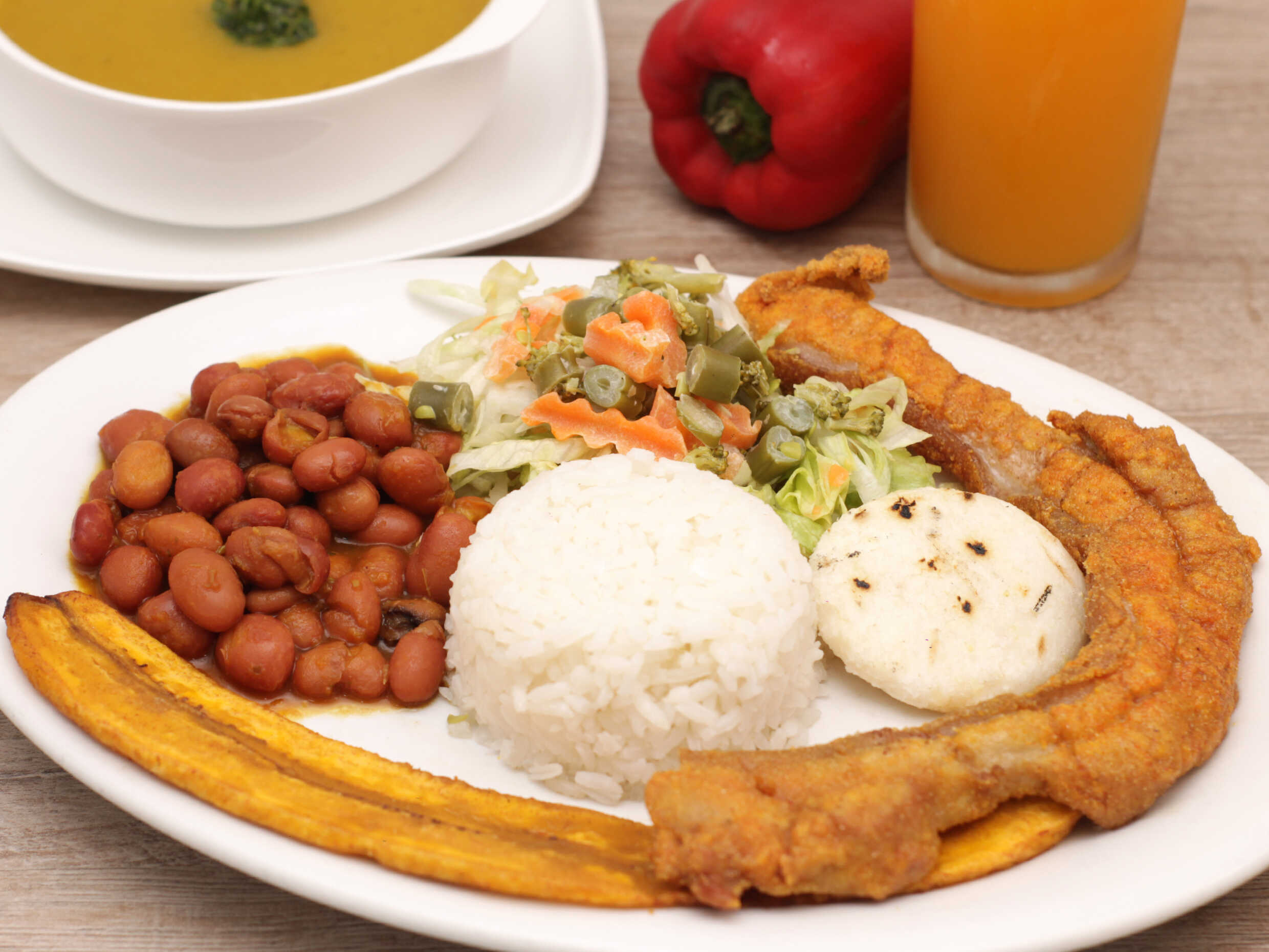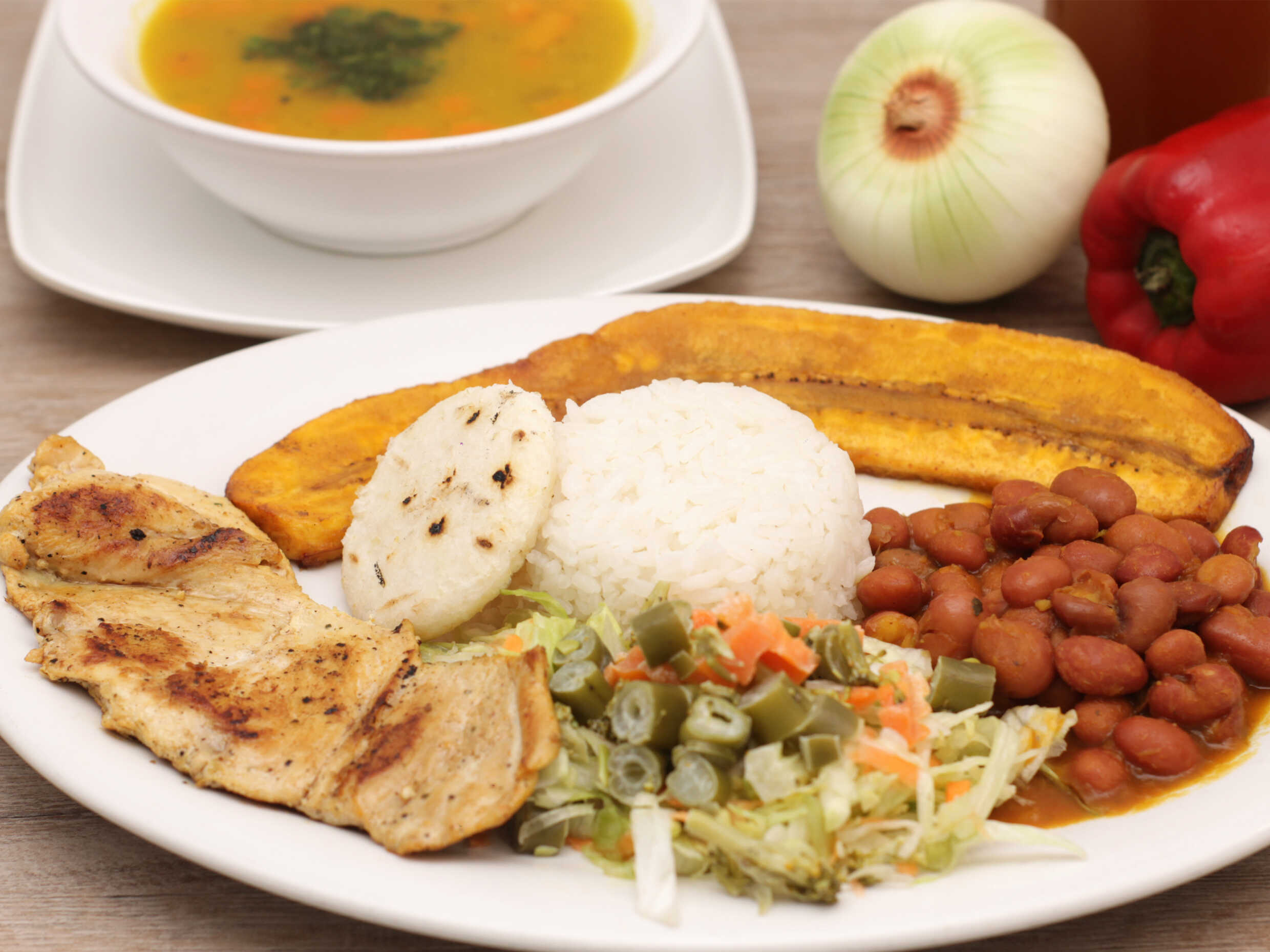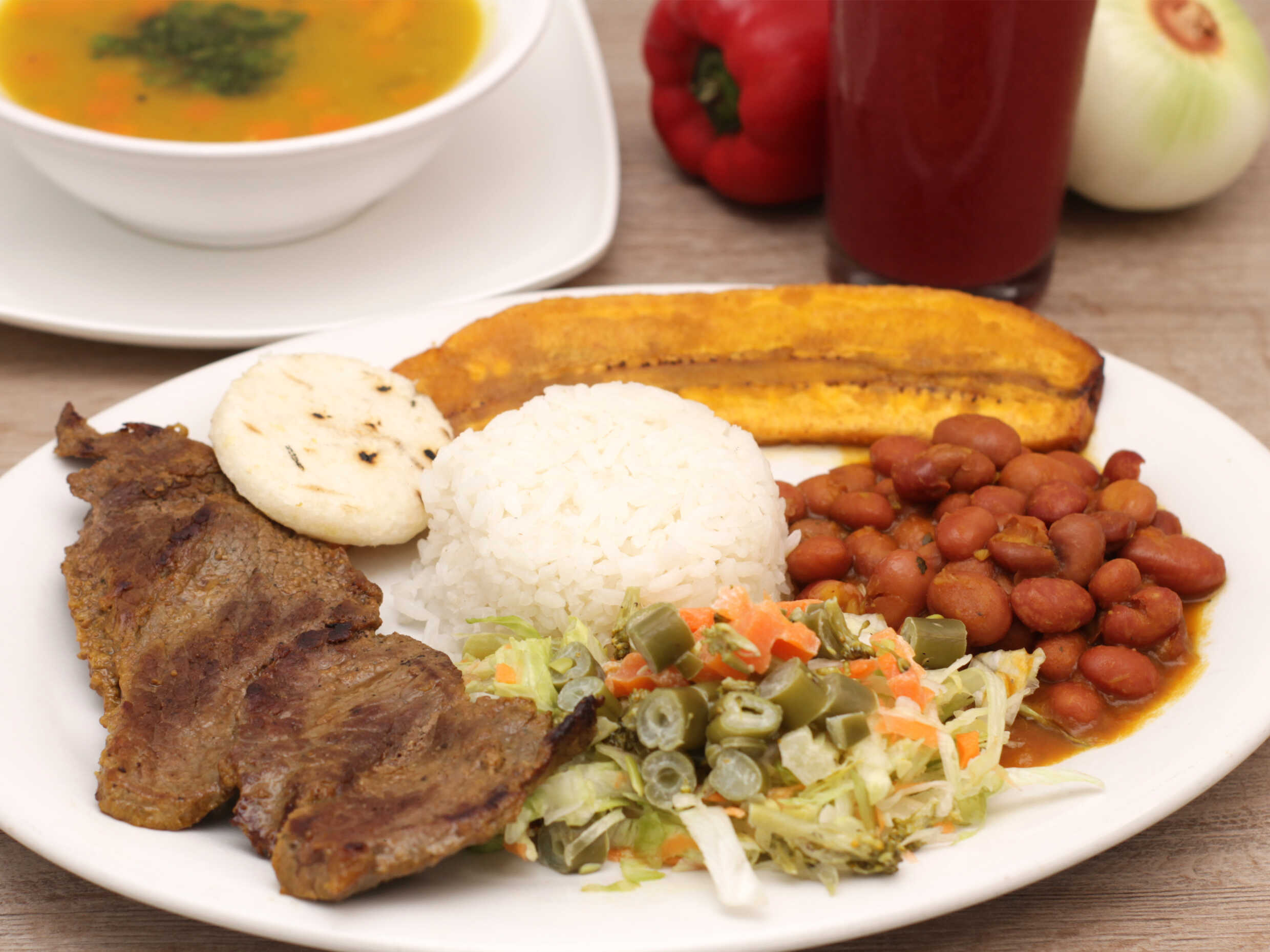 Filete de carne de res de 120g aprox, mas su seco; arroz, tajada de maduro, ensalada, frijol, crema o sopa y jugo del día (Porción Personal).
