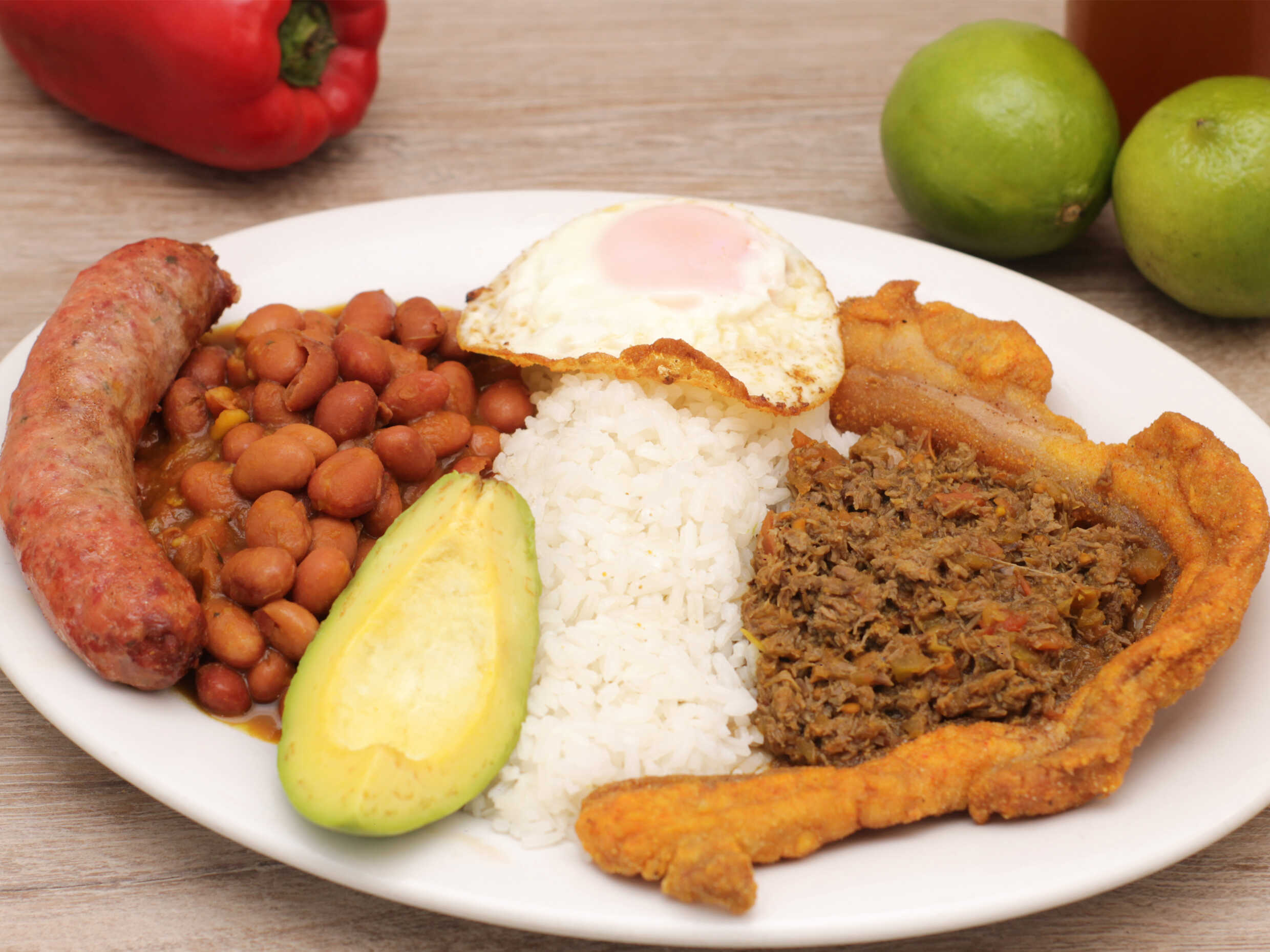 cane molida, huevo entero, aguacate, chicharron, chorizo, arroz, papas francesas mas jugo