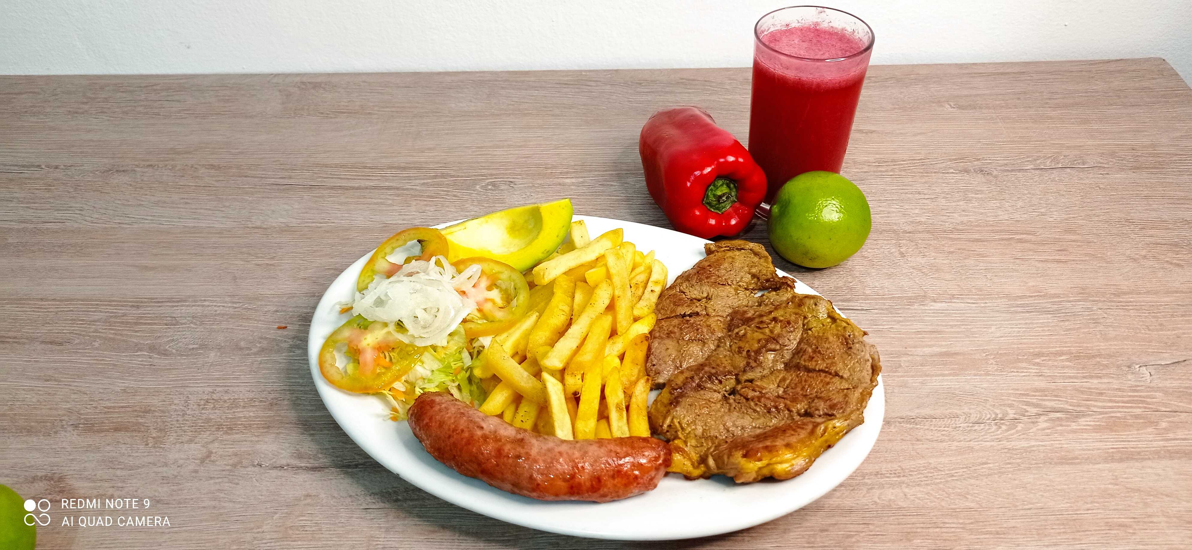 carne de aprpximadamente 250g, con papas, chorizo, ensalada, tajada y jugo