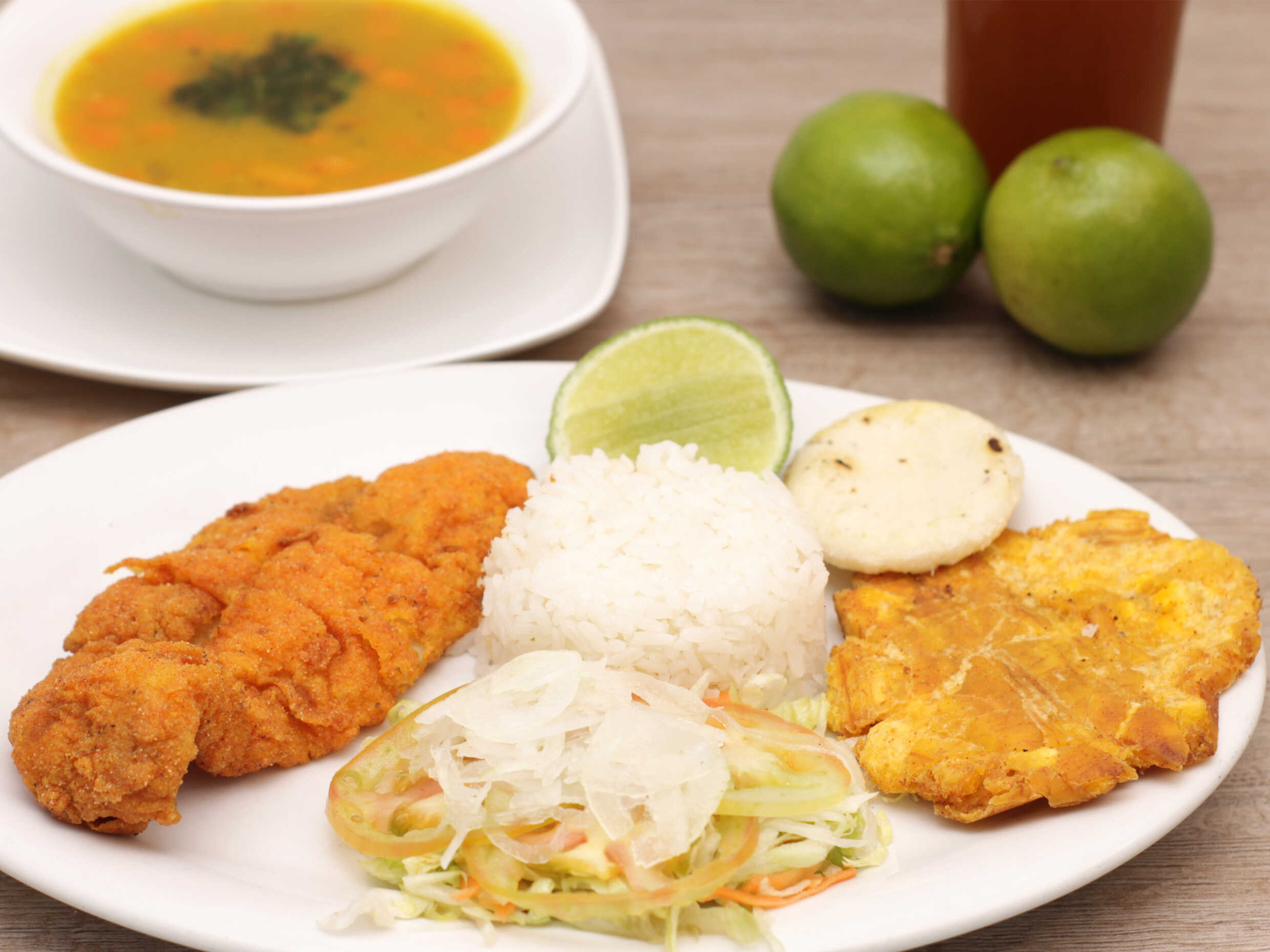 Sopa de pescado, acompañada de robalo o rueda de pescado, arroz de coco. patacon, ensalada, limon y jugo gratis