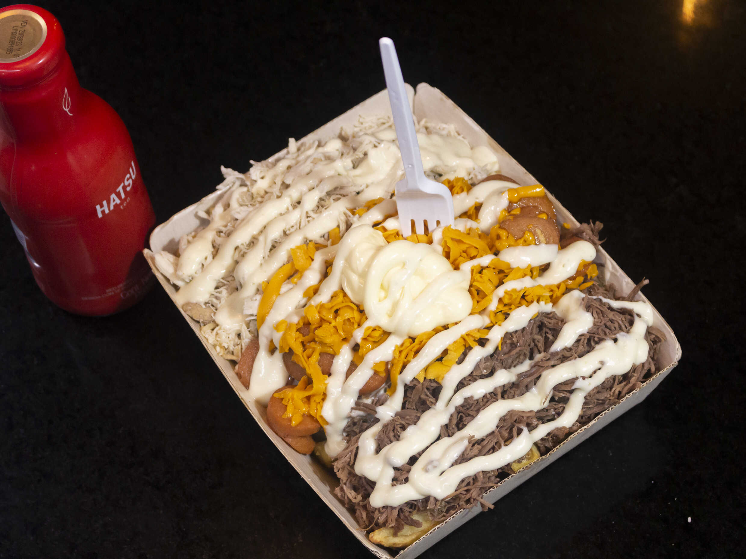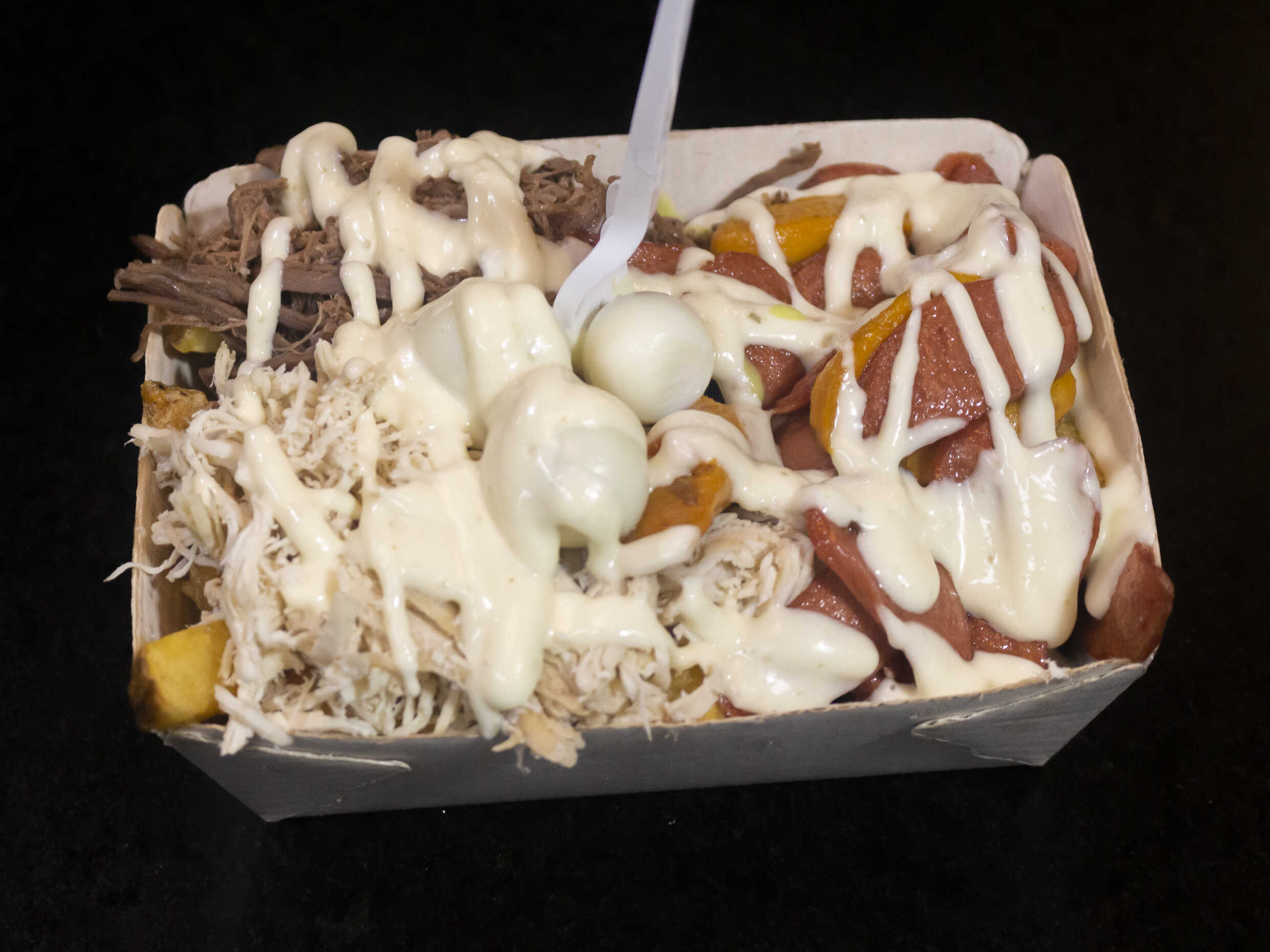 Papas, pollo, carne desmechada, salchicha americana, queso amarillo, sour cream y salsa de la casa.