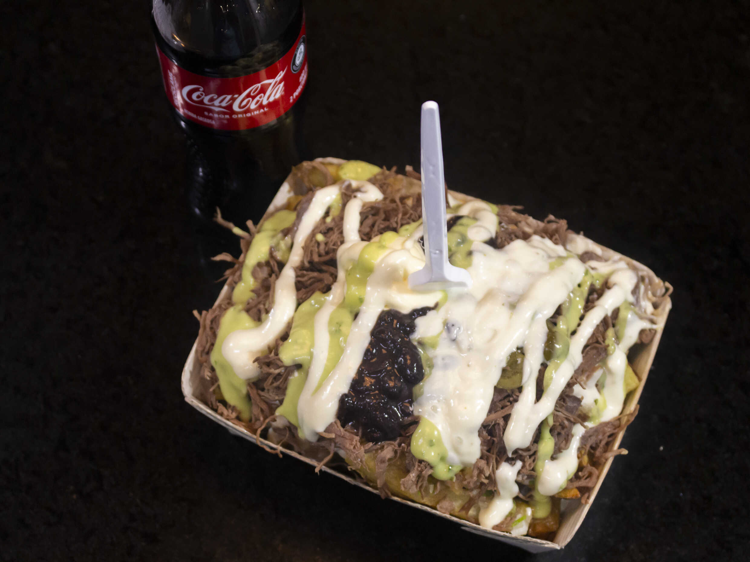 Papas, pico de gallo, jalapeño, frijol, guacamole, carne desmechada, sour cream y salsa de la casa.