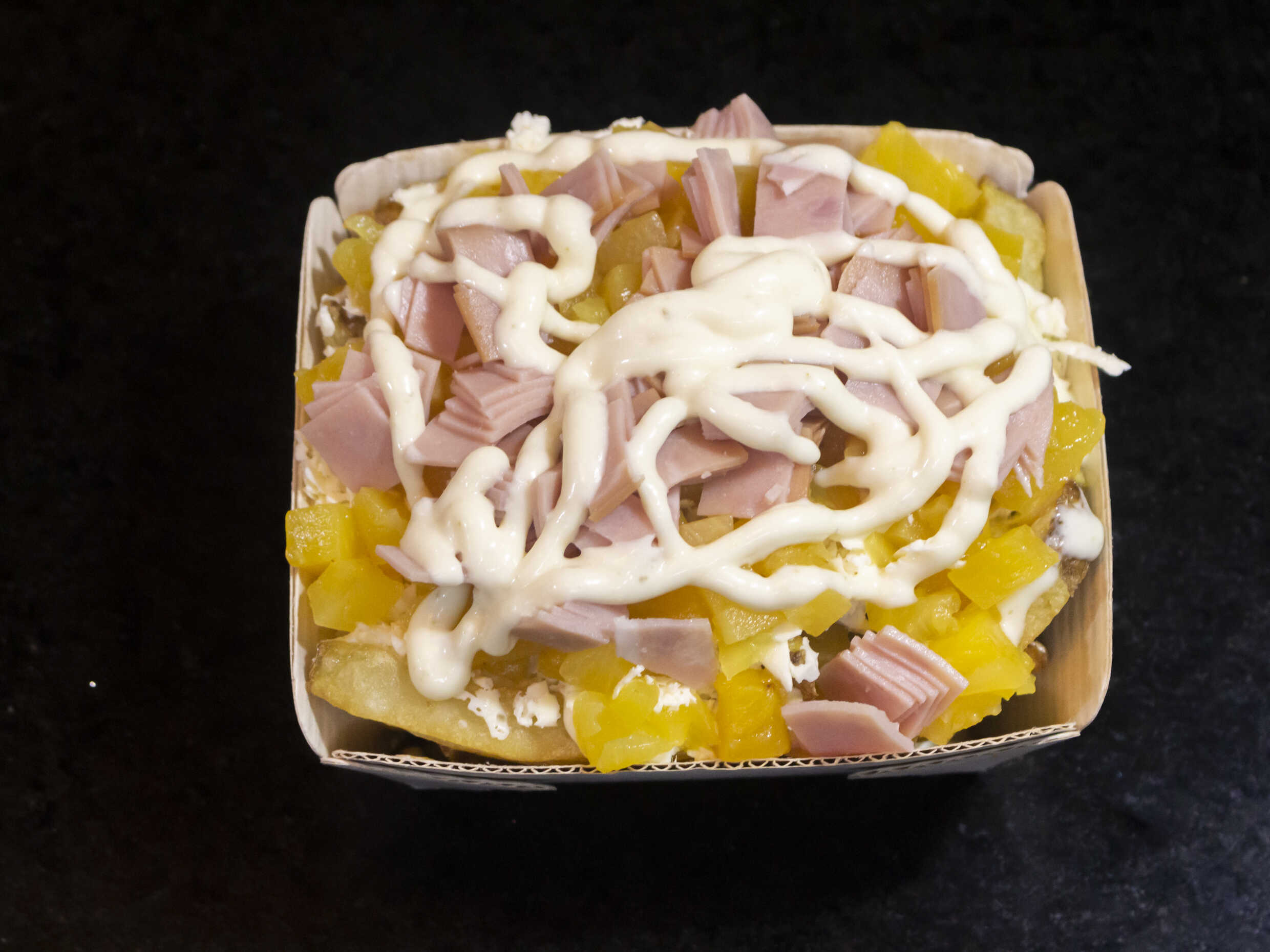 Papas, piña, jamón, queso costeño y salsa de la casa.