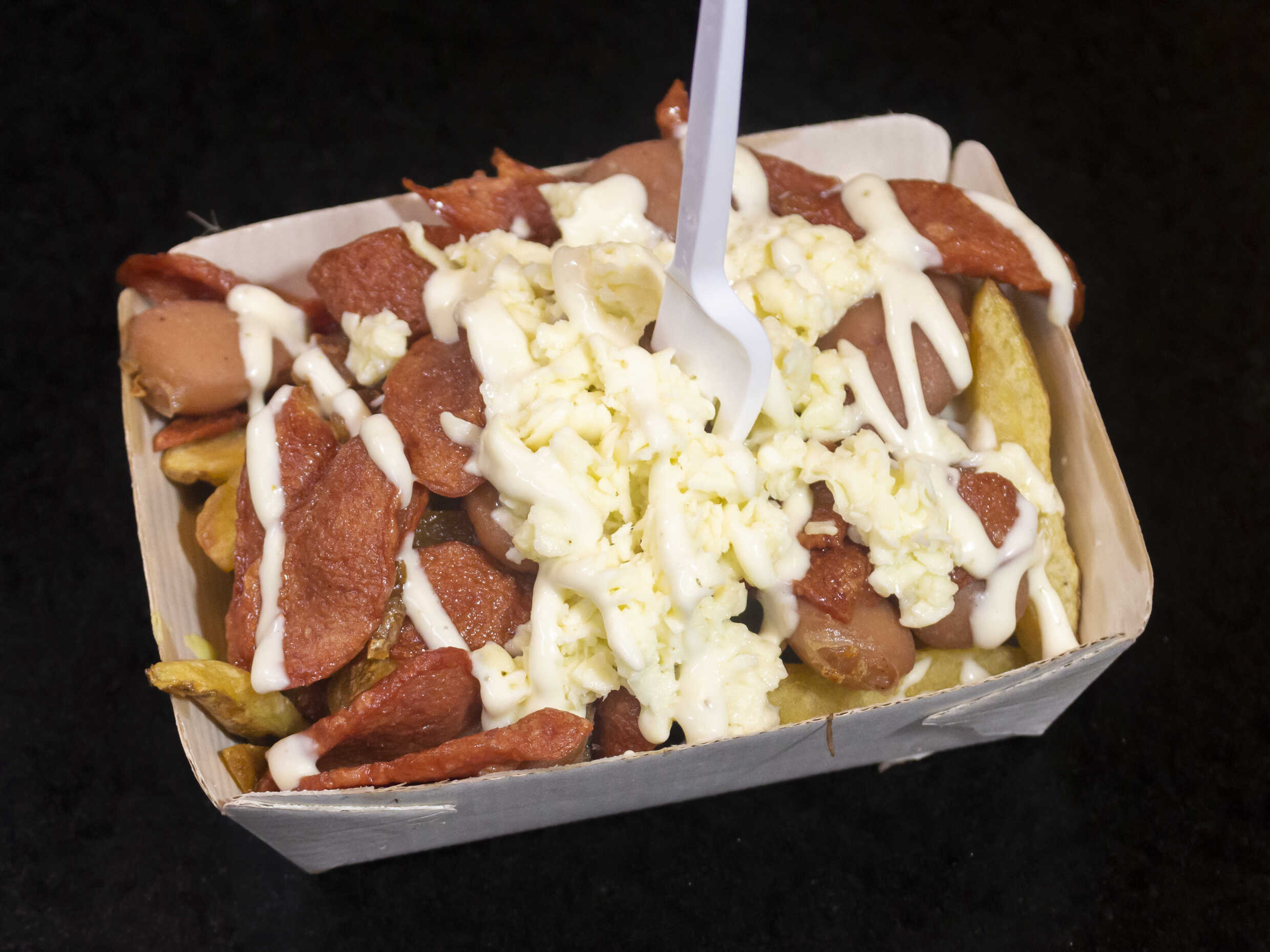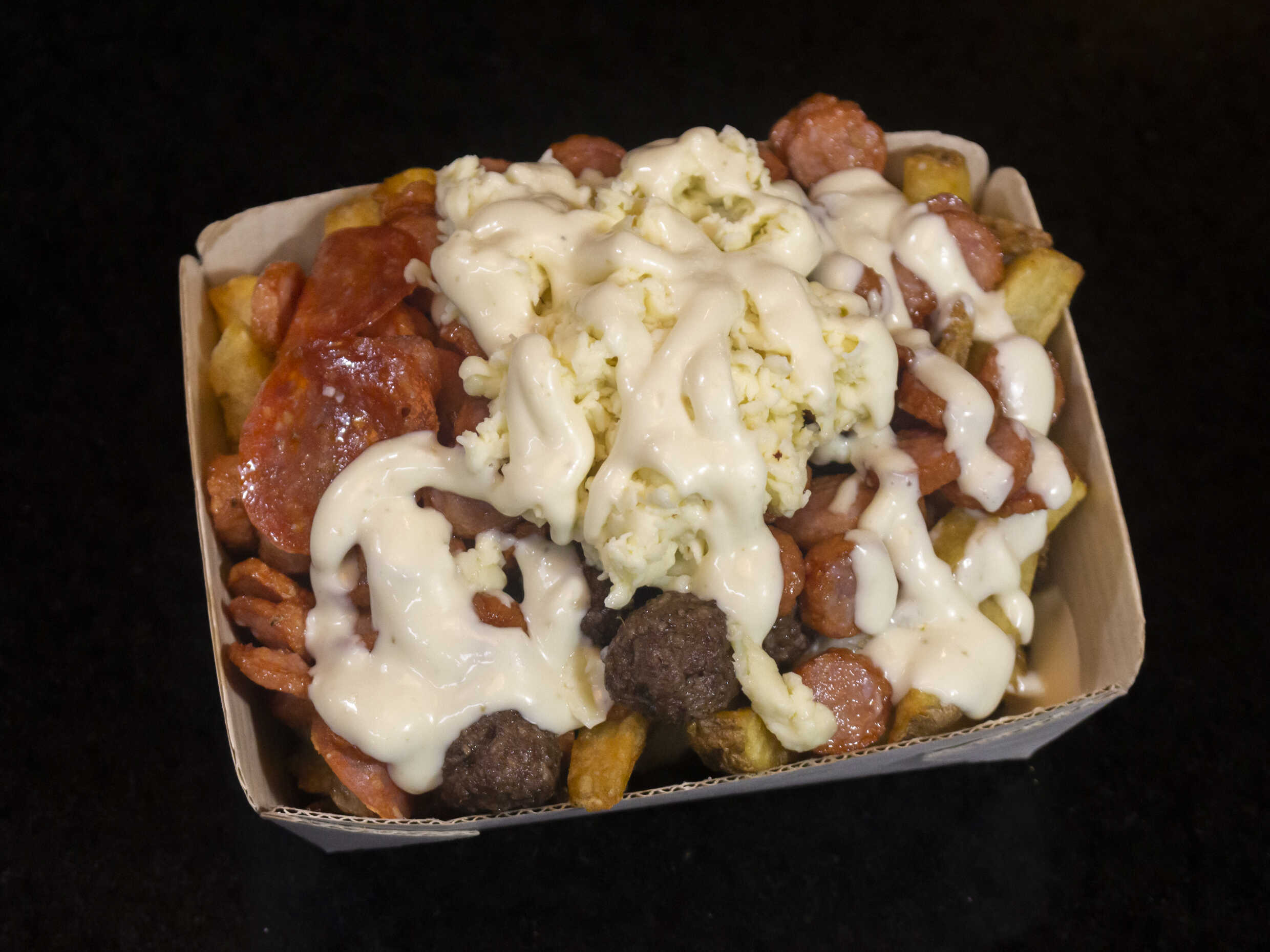 Papas, bolita de carne, pepperoni, salchicha ranchera, queso blanco y salsa de la casa.