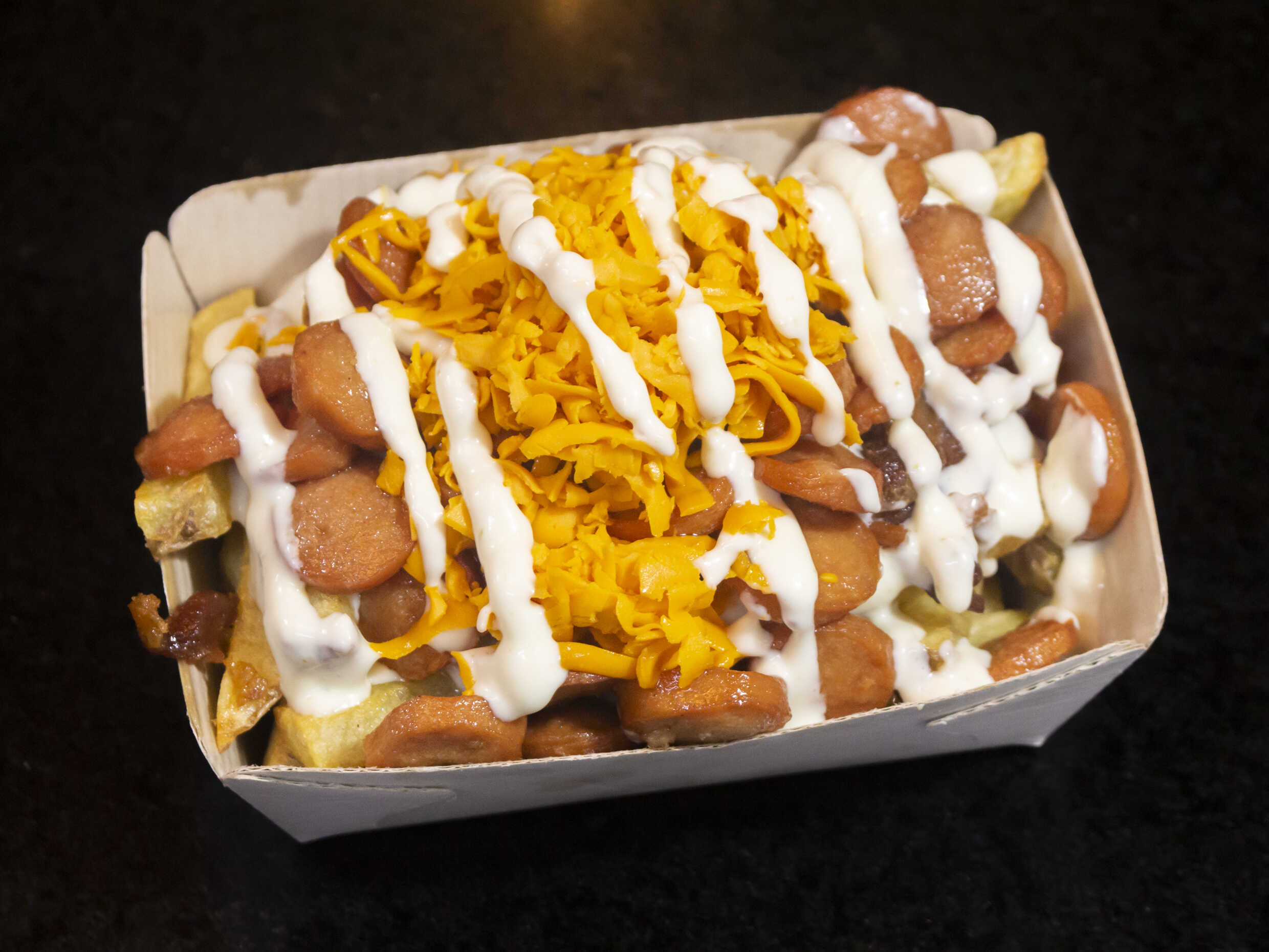 Papas, salchicha americana, tocineta, queso amarillo y salsa de la casa.