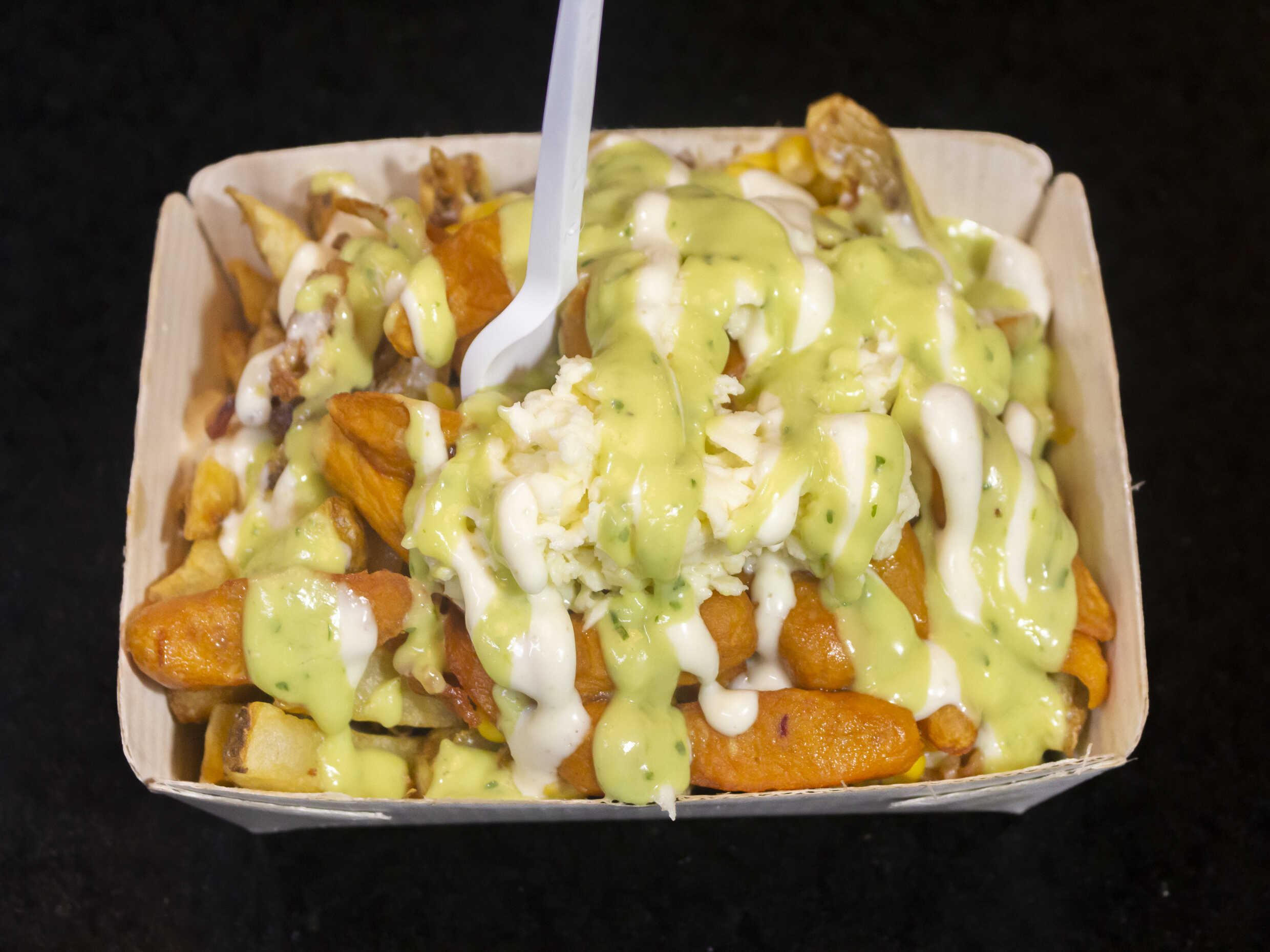 Papas, tocineta, chorizo, guacamole, maíz tierno, queso blanco y salsa de la casa.
