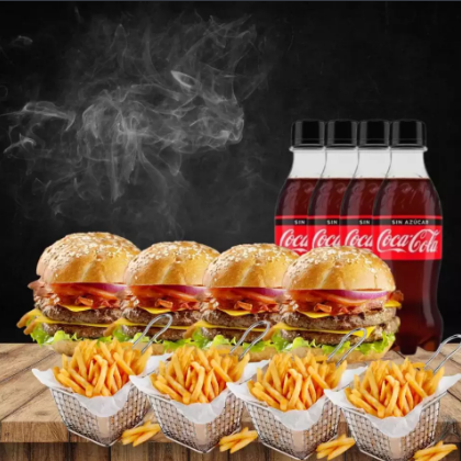 4 jugosas hamburguesas dobles: Carne 100% res, tocineta ahumada, queso mozzarella, queso cheddar, sobre una cama de lechuga, tomates, cebolla caramelizada, en un rico pan artesanal. Acompañada de papas a la francesa y 4 Coca Colas.